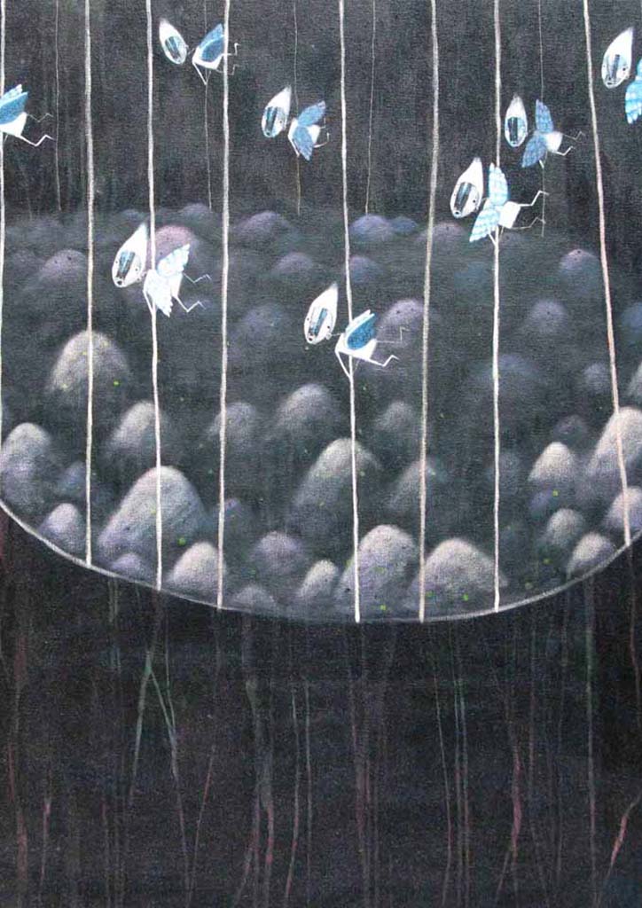 Farley’s biographical origins also speak of a gentler, more nurturing environment where drawing was encouraged, and being an artist for a childhood ambition was deemed natural. Born and raised in Zambales, sixty kilometers west of Manila facing the South China Sea, Farley’s father is an artist, while his mother is an optometrist. The clear air and clean provincial surroundings helped Farley develop a visual imagination that was suffused with the strong Zambal sunlight and the azure seas. Studying Fine Arts at Manila’s Philippine Women’s University (PWU), Farley was already noticed as an art student due to his taking a finalist position at the Shell National Student Art Competition, and representing PWU at the 15th PLDT Visual Art Competition.