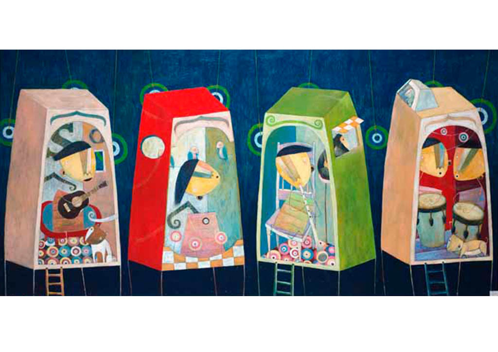 Farley del Rosario’s other paintings, such as those that extol the carefree life of youths as they play in fantasy landscapes (Musical Carousel, Kettle and Hide), celebrate birthdays (High Five), and work out a sweat in individualized musical houses (Friendly Neighbourhood) seem to speak both about the loss of innocence that most of us feel when we are thrust at “too young an age” into the world of grownup business. One other thing must also be remembered, though. Farley’s talent at looking back on our contemporary lives as punctuated by our own foibles and heartaches also reminds us that the age of innocence need not be equated with the age of ignorance. In this regard, Farley del Rosario’s unique use of a clear naïf illustration style to bolster one’s credentials in a particularly adult art world where competition is keen, and innovation, from whatever source or discipline it may originate, is welcome when the strains of conceptual exhaustion by a community becomes an obstacle to future aesthetic growth.