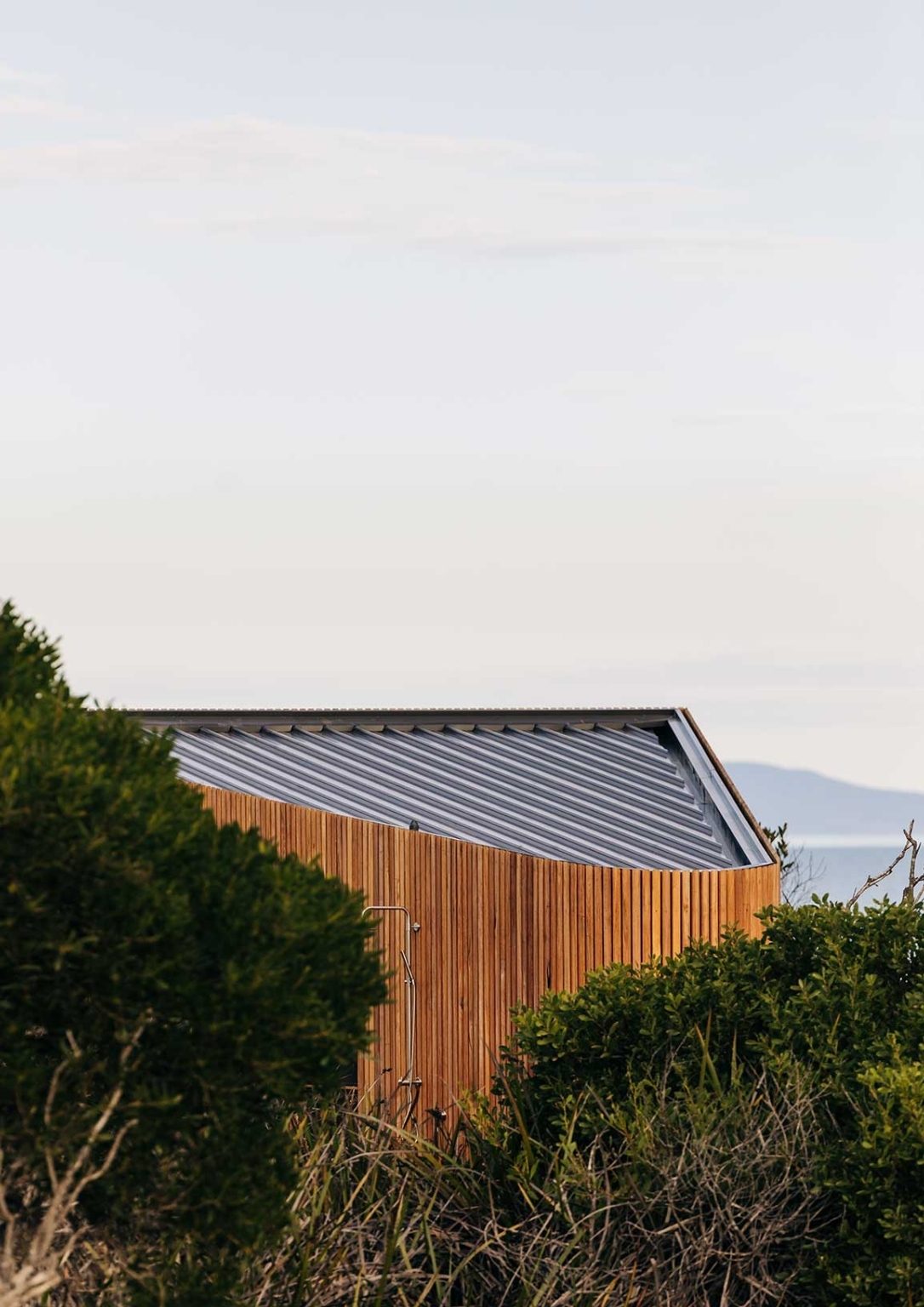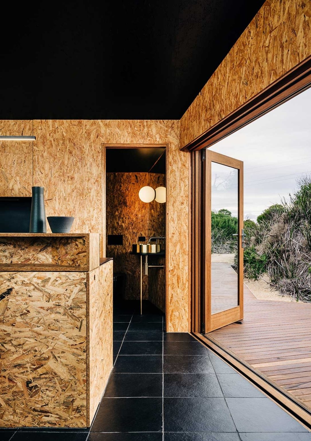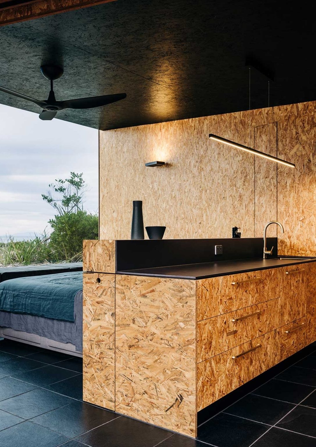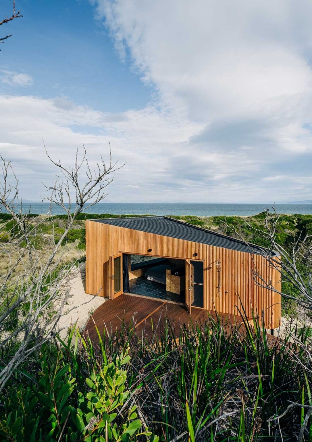 Ethically sourced timber slats with minimalist aesthetic make up the exterior. The interior blends in as well with its exposed OSB walls. The floor is made of black tiles, a classic color to compliment the wood accents. The whole home is elevated from the ground thereby making it possible to have an unobstructed view of the surrounding. The outdoor deck made of hardwood is where you can find the exterior shower and a compact space to lounge. The bedroom overlooks the ocean through a large panoramic window placed by the foot of the bed. The house is tiny but well thought of and ready to provide comfort.
