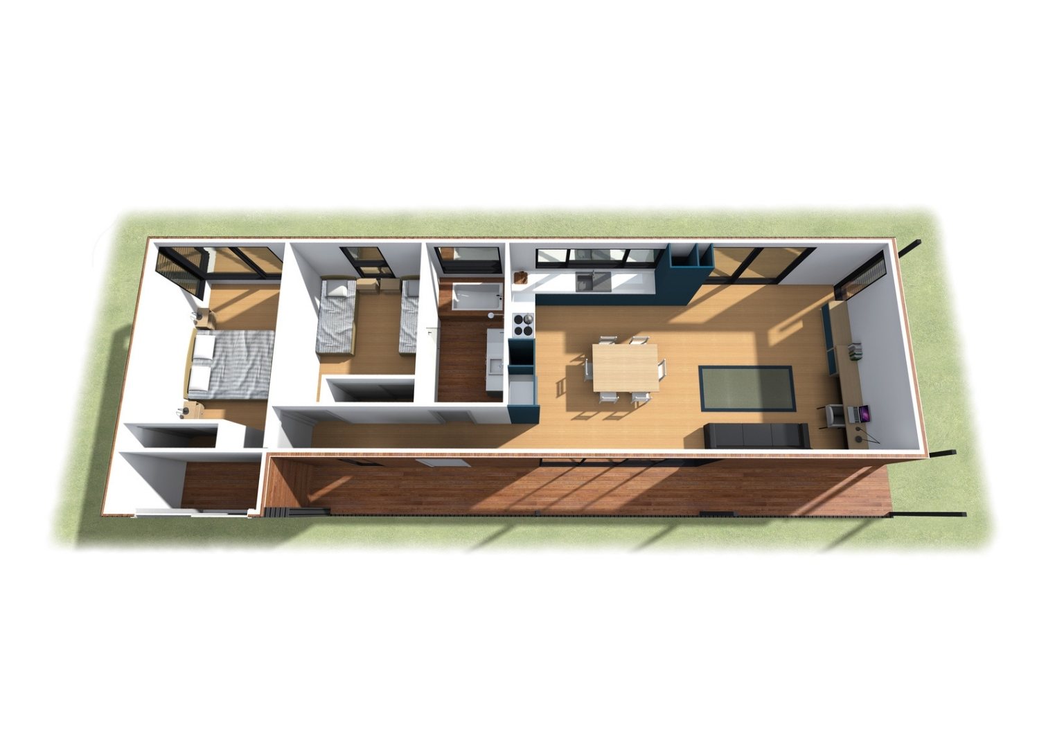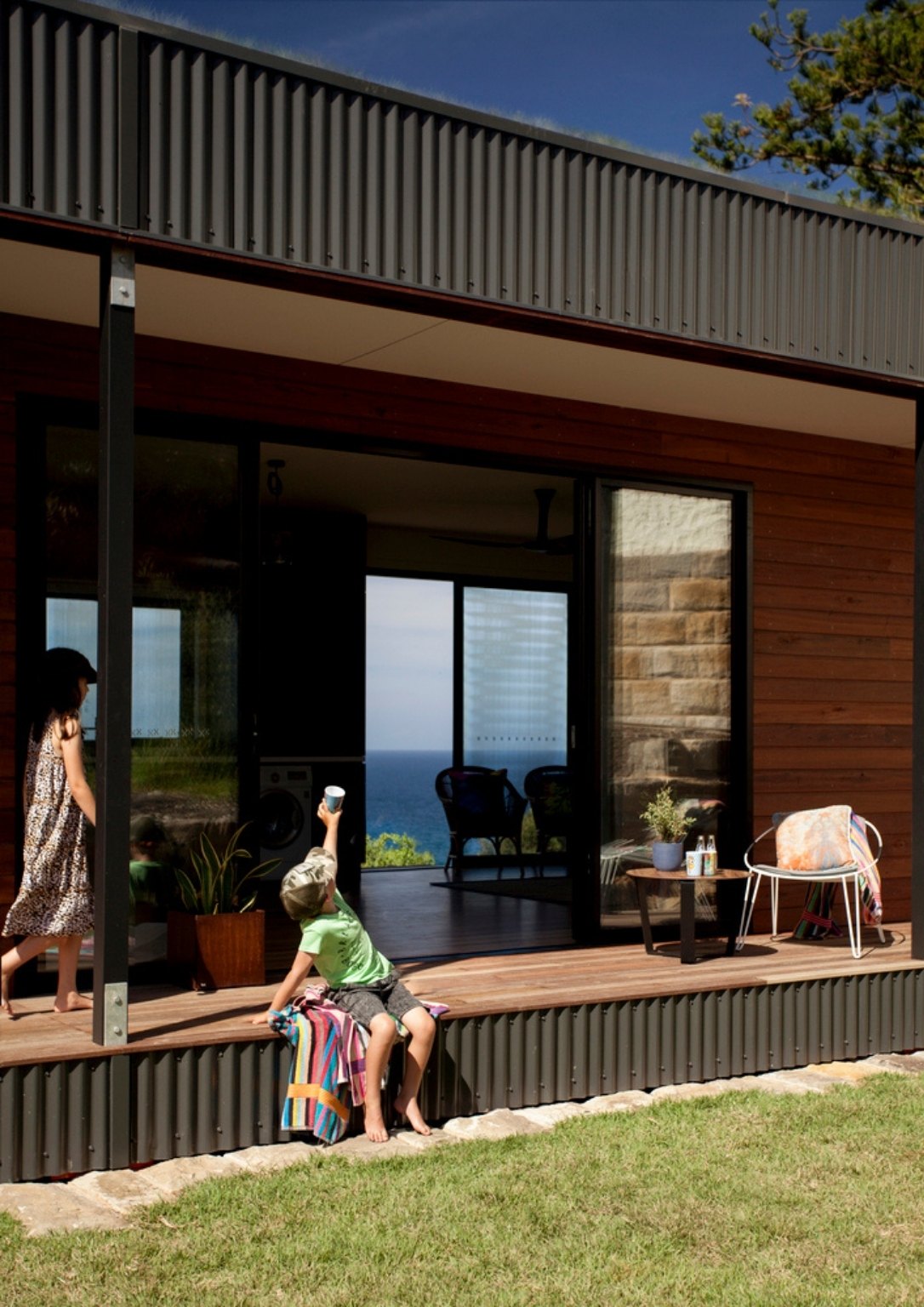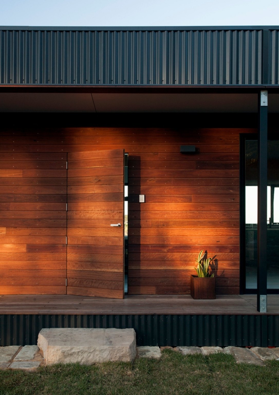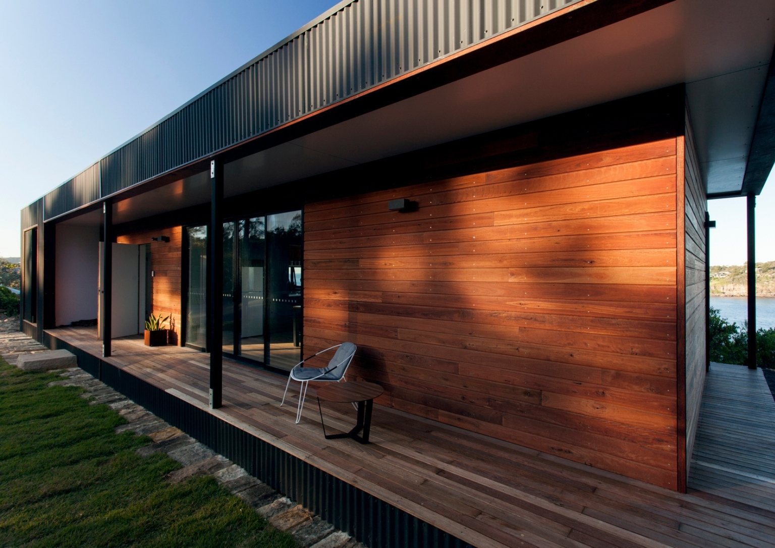 Other sustainable features of the house include the use of hardwood timber milled from sustainable forestry methods. Wood planks exquisitely envelop the house exterior creating balance with the metal structure. Its fabrication off-site results in attentive control over material consumption and waste. The house being pre-fabricated has a low impact on the surrounding environment, especially during completion. Moreover, rainwater from the roof flows into a 7,500.00 liter tank and is recycled for garden irrigation.