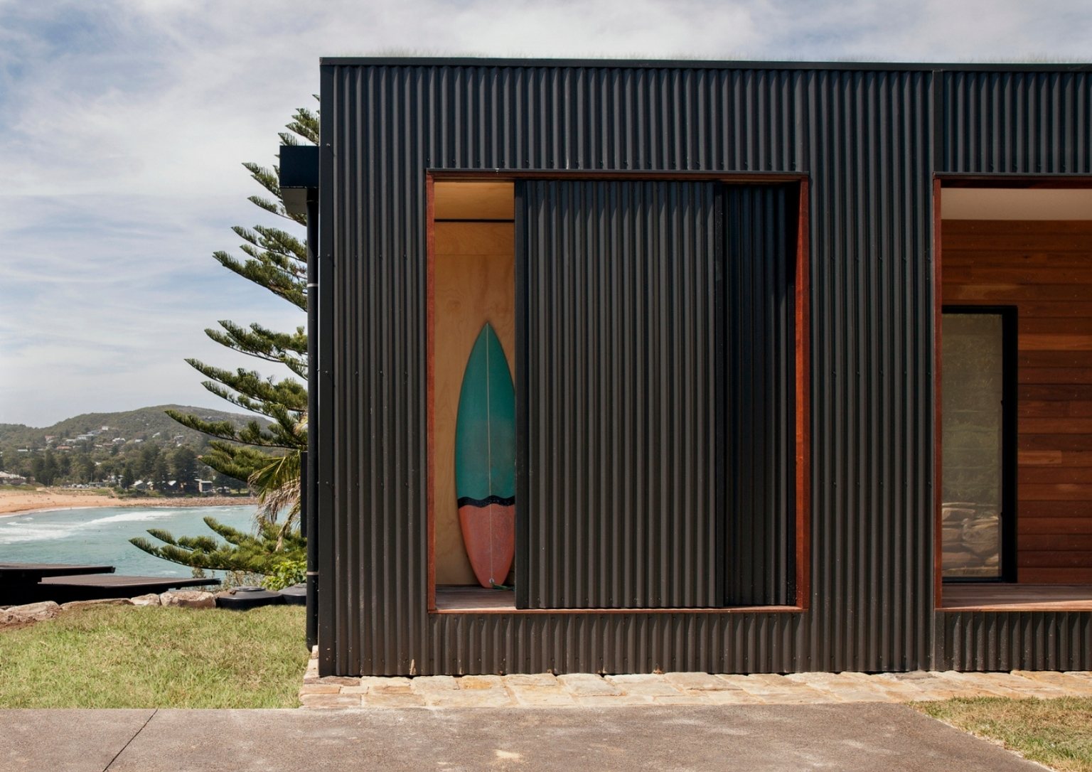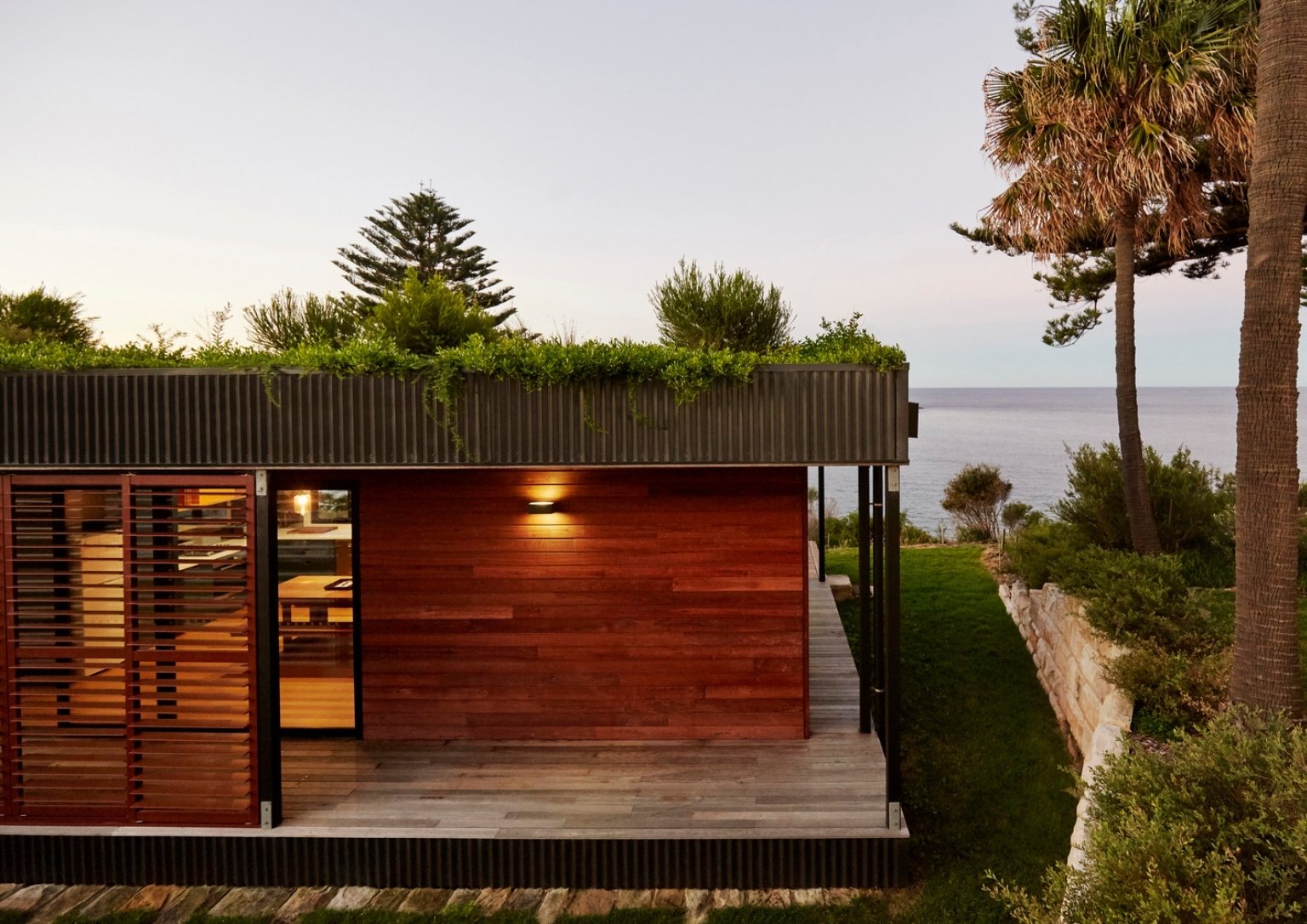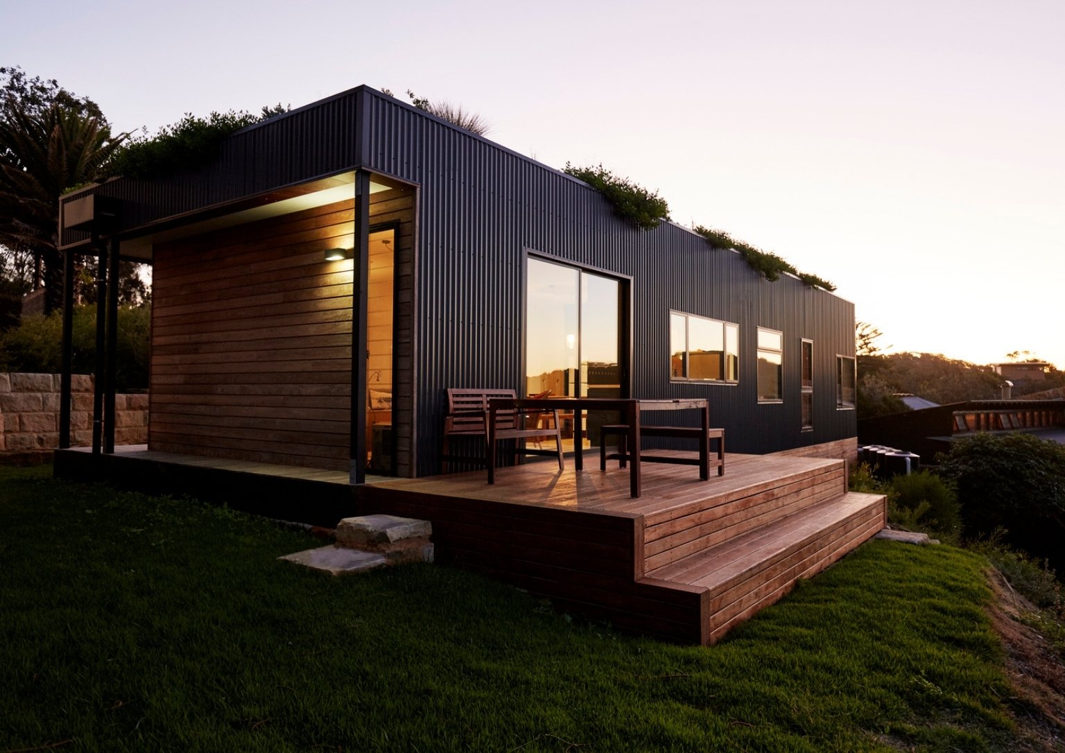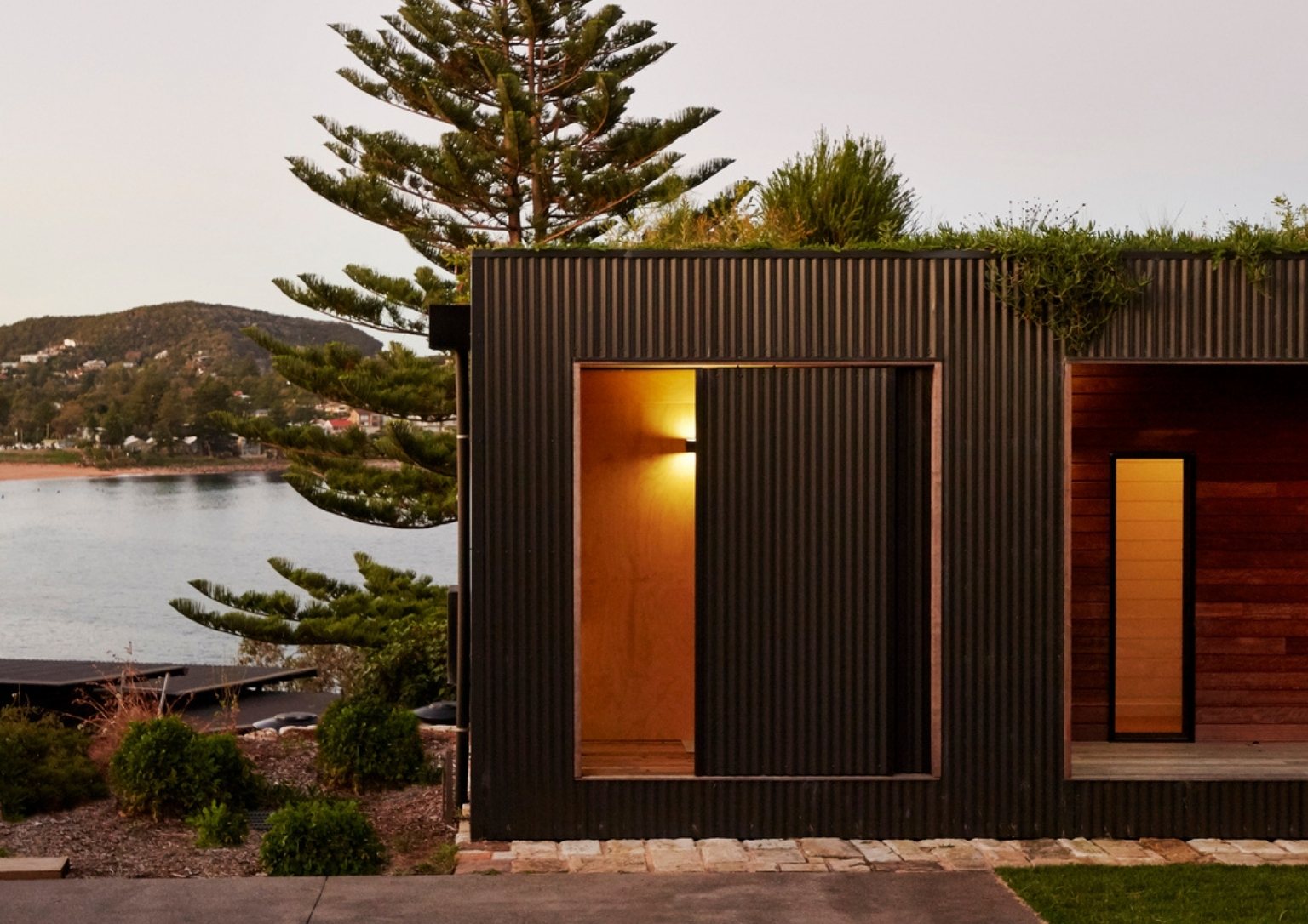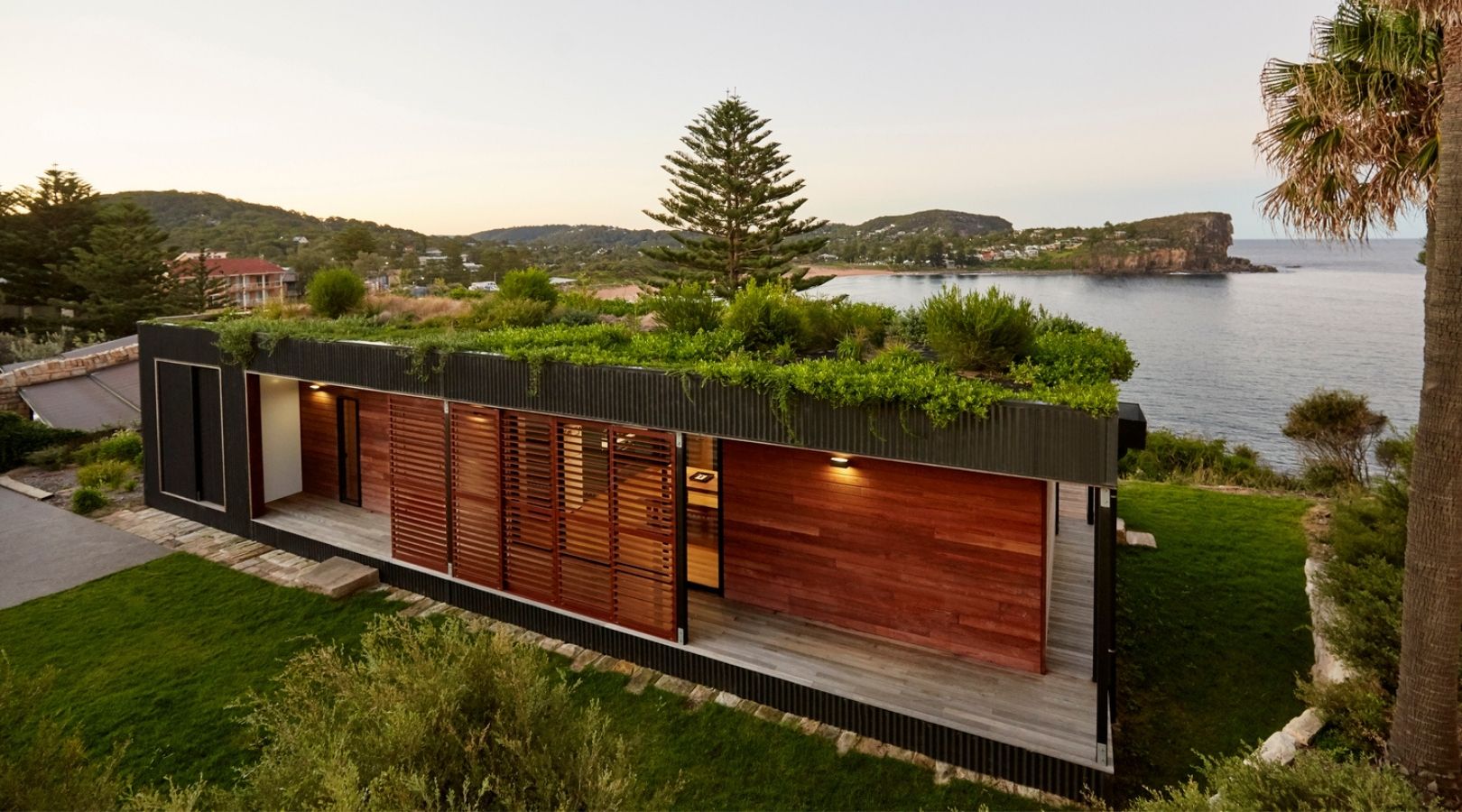 In the coastal perimeter of New South Wales, Australia sits the Avalon House. It is a pre-fabricated 106 square meter structure that boasts a unique green roof. Archiblox constructs this 16m x 4.6m module home with significant consideration for the environment. The team fits 2 bedrooms with walk-in robes, a bathroom, an open plan kitchen, a dining and living, and a storeroom inside the rectangular house. An outdoor veranda effectively frames two facades providing a lounge area that overlooks the coastal scene.