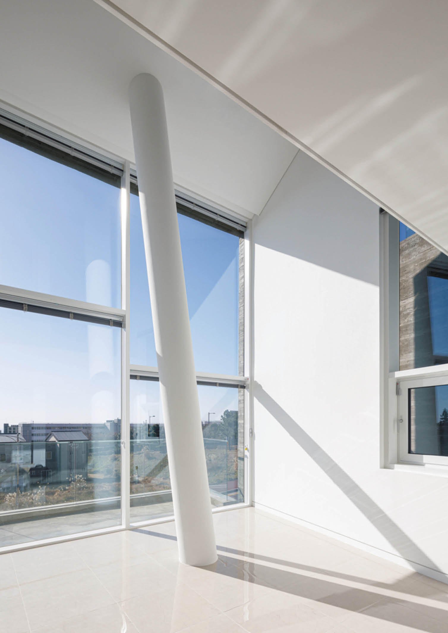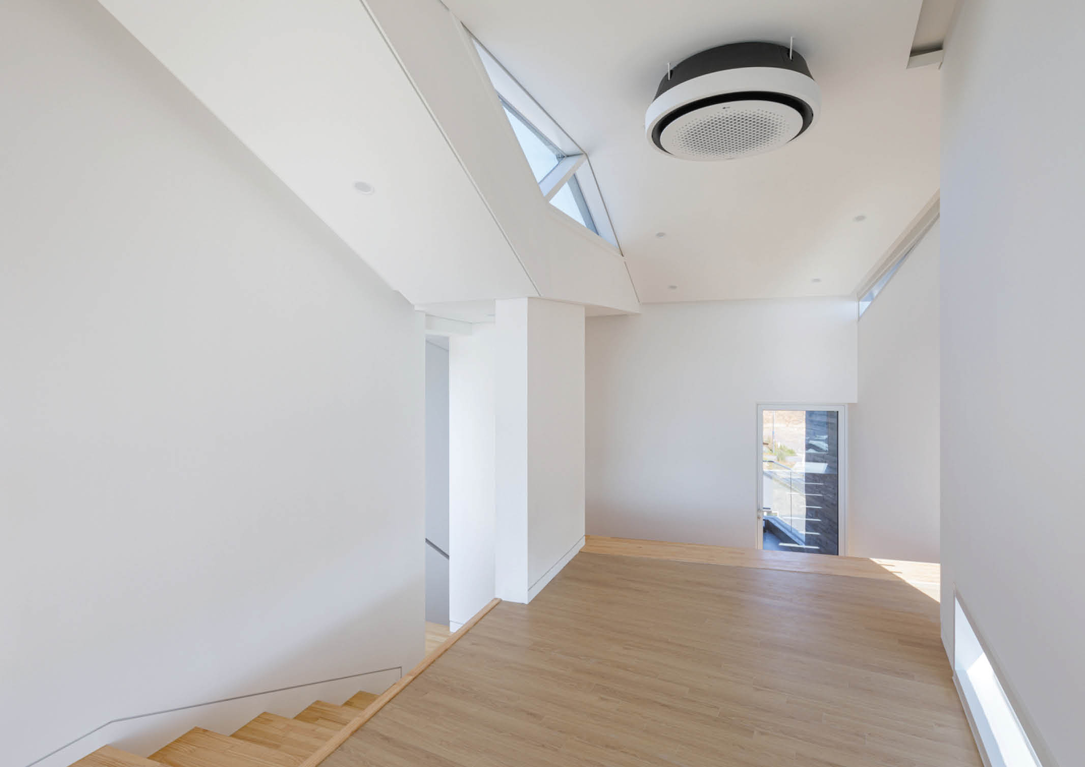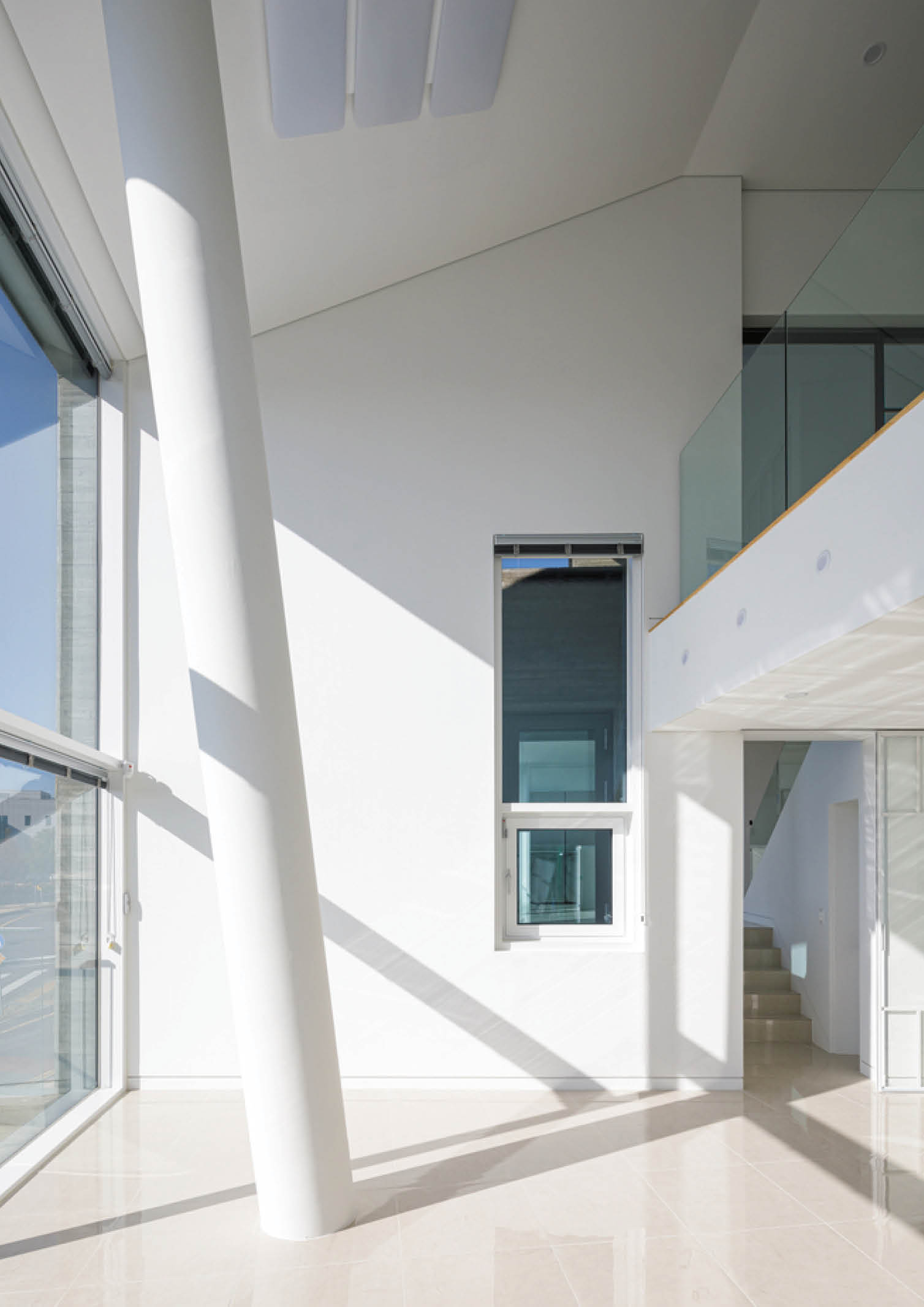 The south-north axis library has step seats to the northern side which provides a door to the balcony. Here, residents can view the Halla Mountain. The top floor concludes the solidly stacked wave gesture.