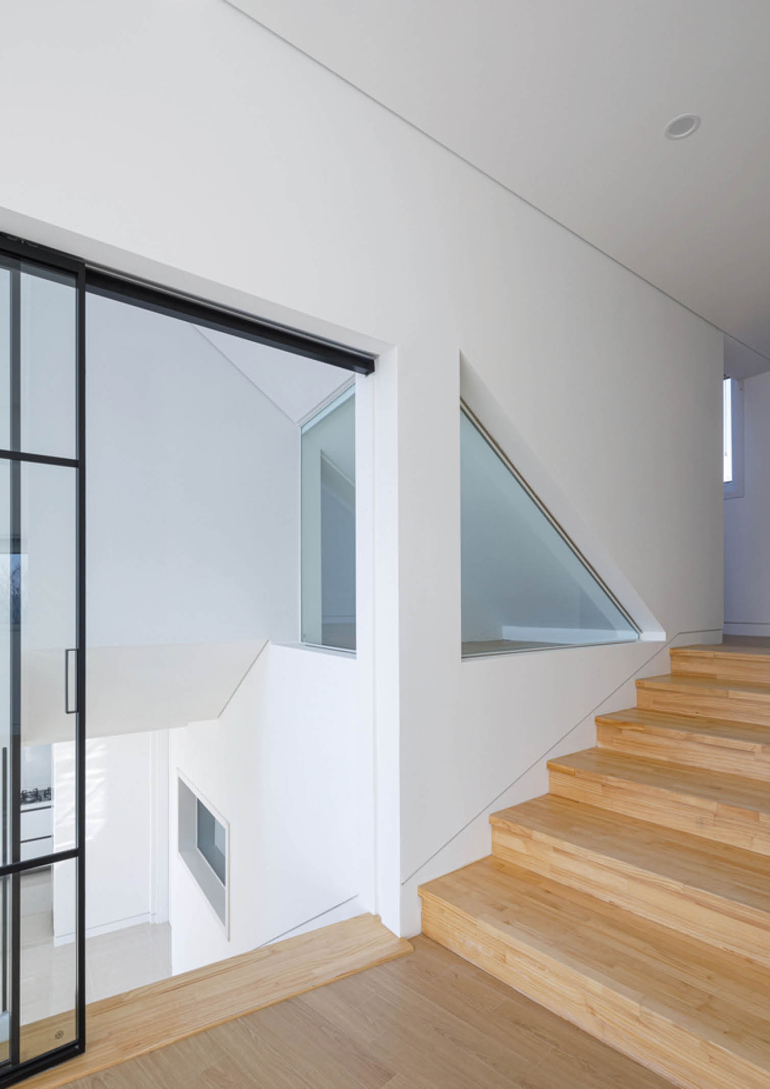 Moreover, the foyer does not give any visual key to the main space unless one makes a turn and ascend a few steps. For the living space, it features a double-height space with an angled column supporting the library on the forth floor. The kitchen/dining area is located a few steps up the living area. Moving through more steps will lead one to the rooms of the client’s future kids. “This ascending movement through steps and ramps continues all the way to the top, where there is the library with a great view of the Pacific Ocean,” explains Architect Moon.