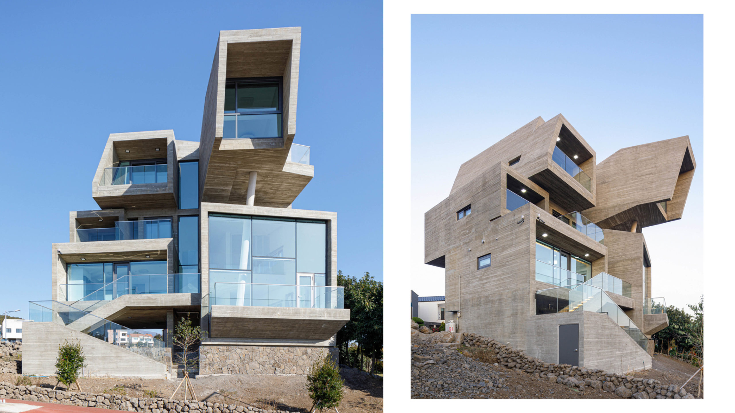 Jeju Island is South Korea’s largest island and a popular destination for both locals and tourists. It is home to beautiful beaches and lush vegetation with a tropical climate that attracts visitors. The island also has an interesting local architecture. In Seoguipo, the second largest city of Jeju, a residence stands out in its neighborhood for its concrete volumes and interesting form.