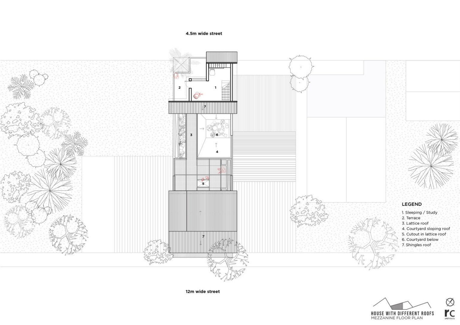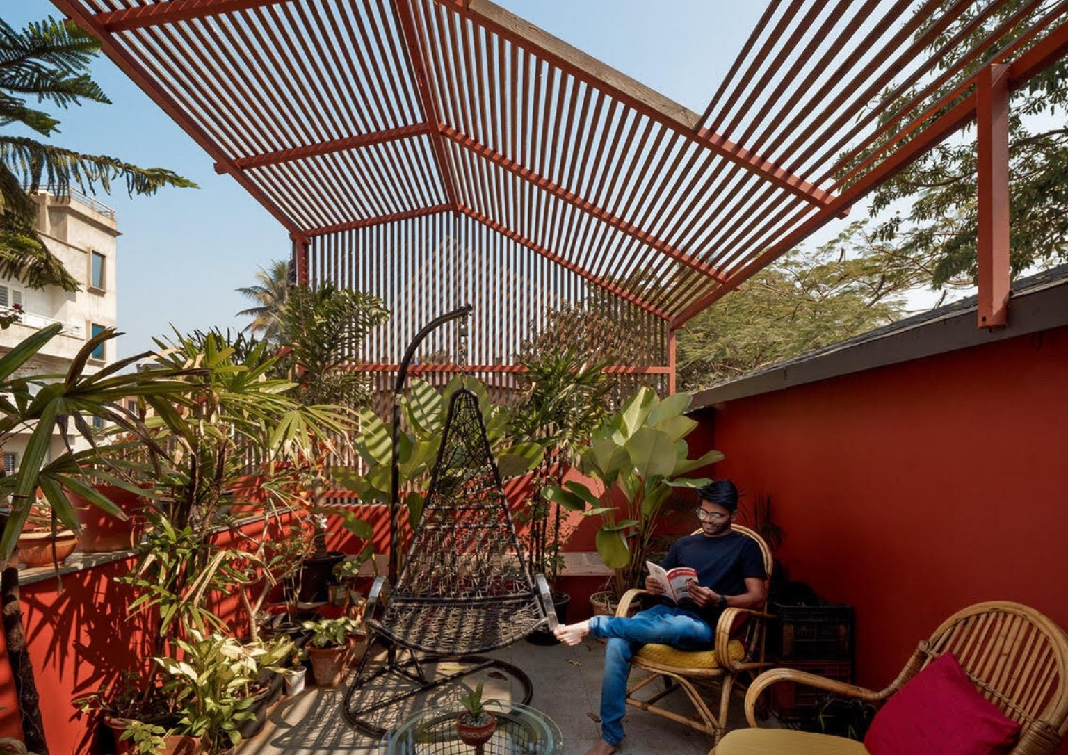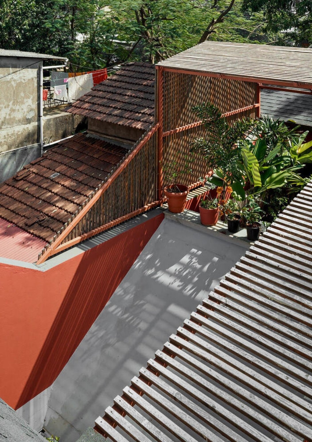 Ultimately, pinewood lattice cover provides shade to the common terrace, where residents can gather. An open sky terrace next to the covered one is also offered overlooking the ground floor’s garden.