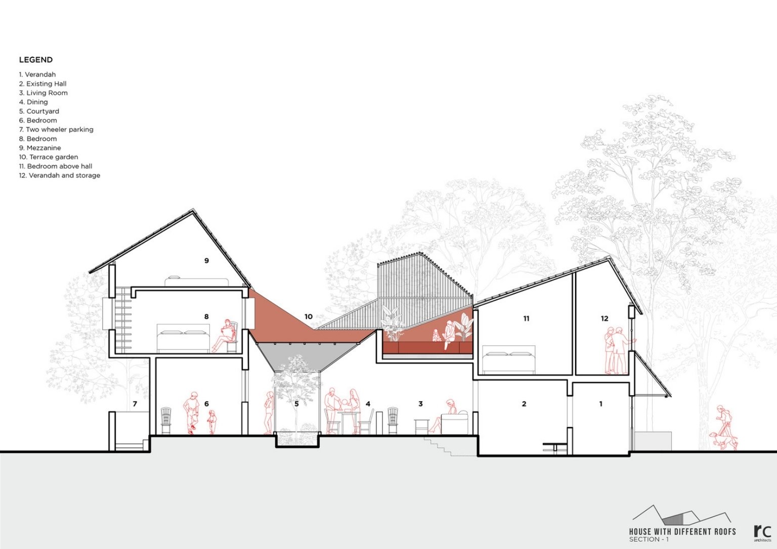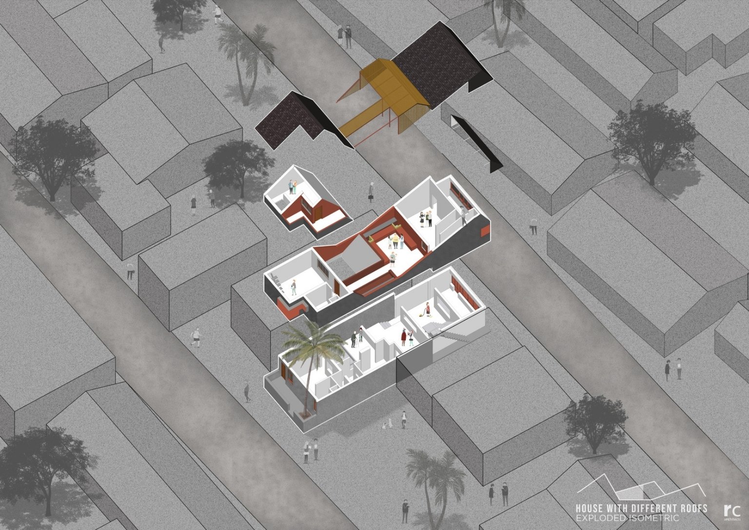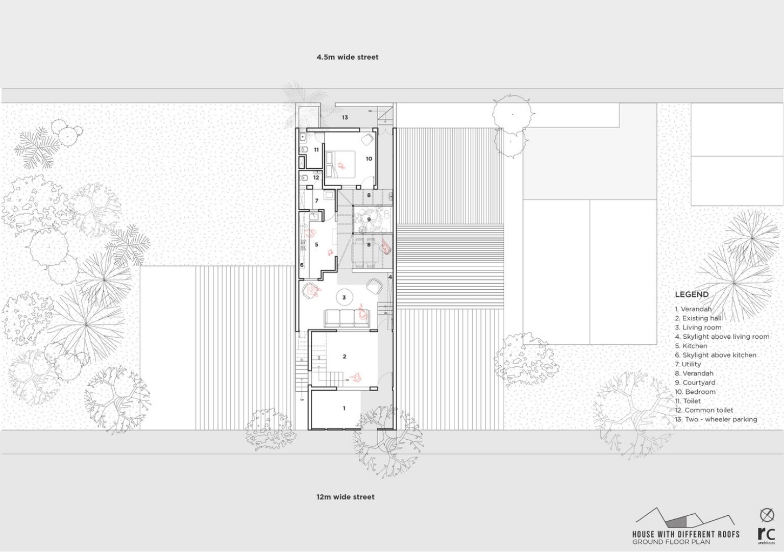 In a dense neighborhood in Gadhinglaj, India, is the ‘House with Different Roofs’ by RC Architects India. The project envisions maximum natural light and ventilation for the house while retaining privacy. Different roof types cover the entire house delivering an extraordinary experience for each space. The architectural team designs the structure with elements that allow organic ventilation sources and provide separate zones for simultaneous activities. The built structure presents a unique concept in its suburban setting.