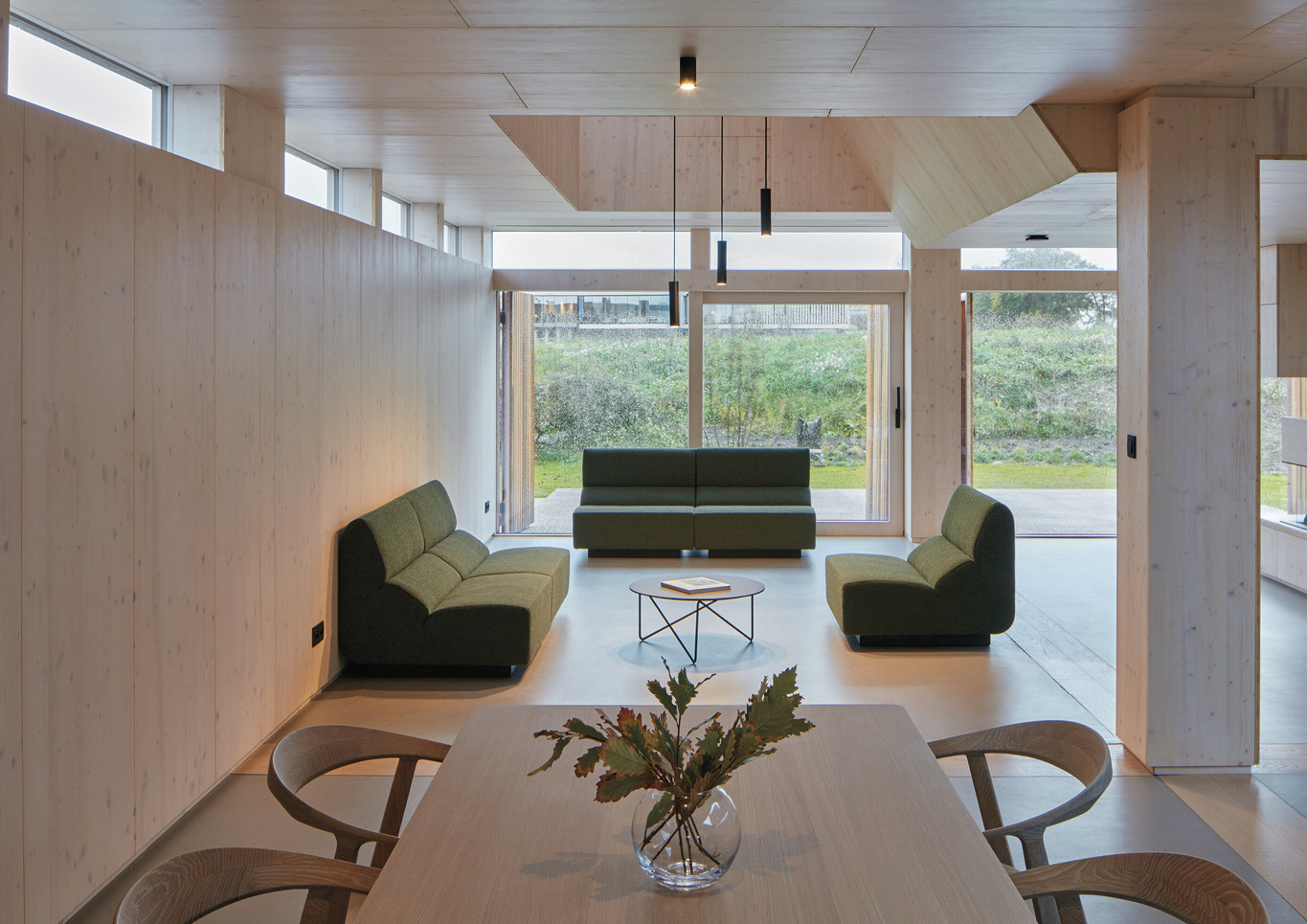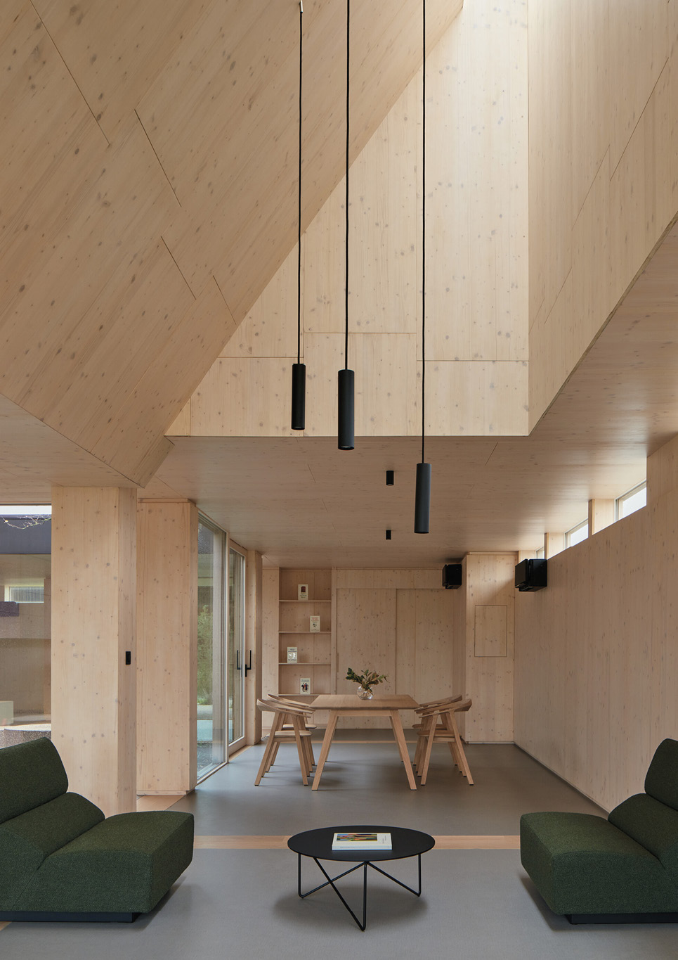 A dining area surrounded by wooden walls and ceilings inside Warm Nest, a Maggie care facility.