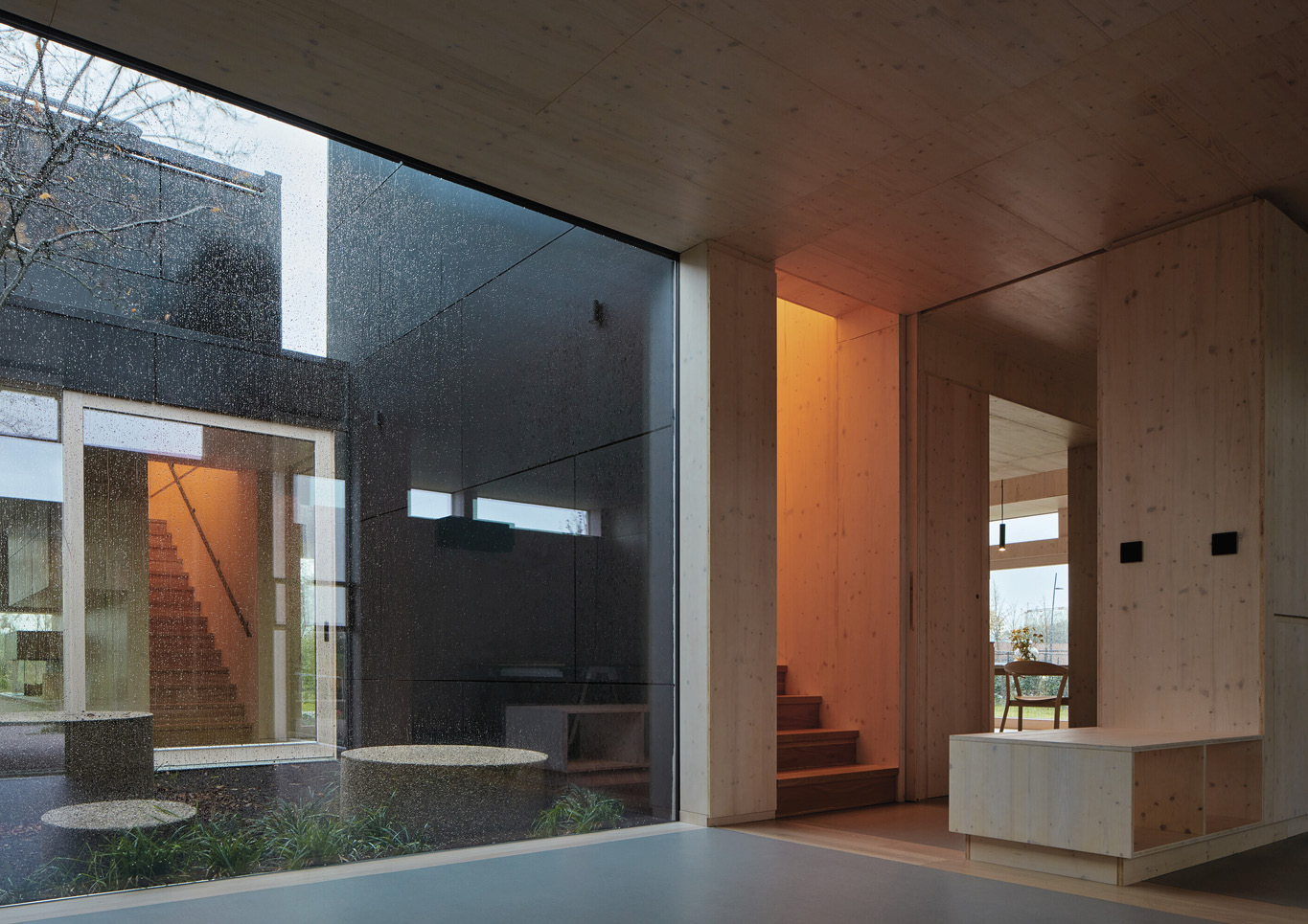 The courtyard, a serene and calm slice of nature, lavish green, protection from wind. The play of light that this skylight will provide will transform the space throughout the day and throughout the seasons, from warming colours to bright patches the wood will reflect the light and warm up the space.