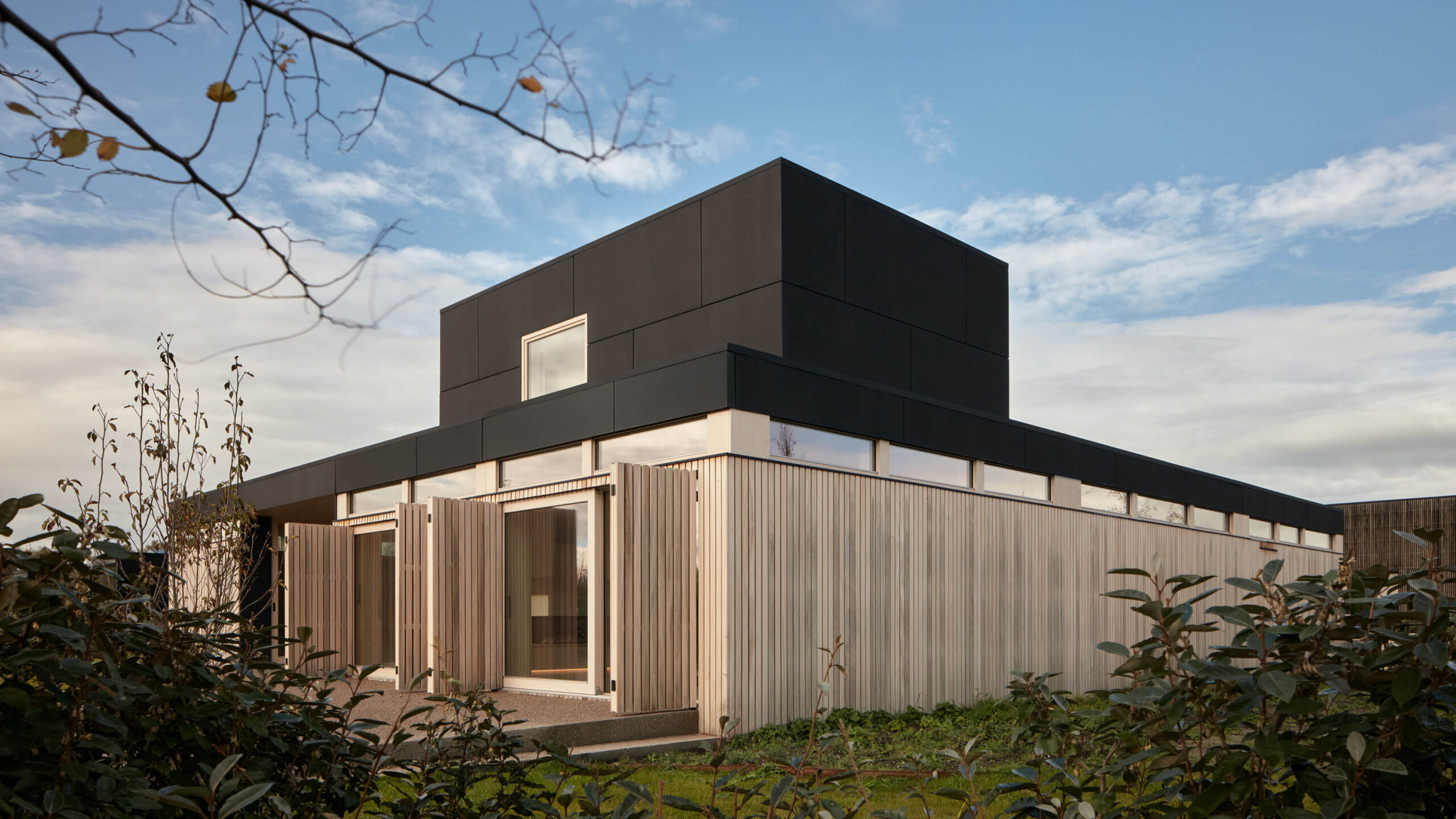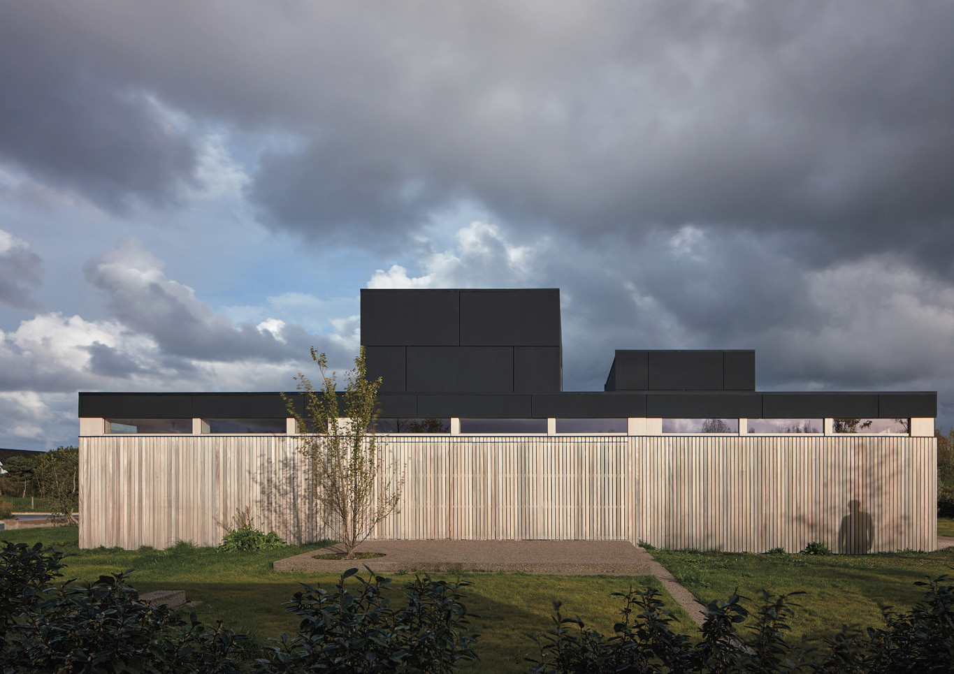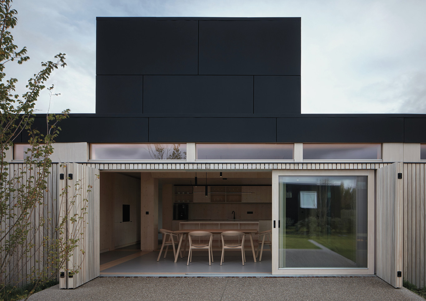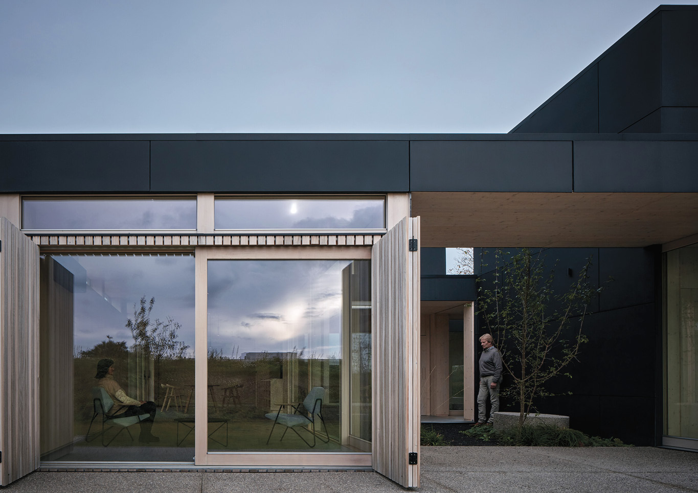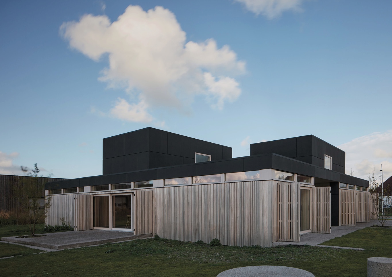 Firstly, the Warm Nest has a rectangular plan which makes it easy for wayfinding and mobility. Wood and glass form the modernist-aesthetic appearance of the exterior. The cleanliness of its lines gives a certain sense of stability which complements its box silhouette.