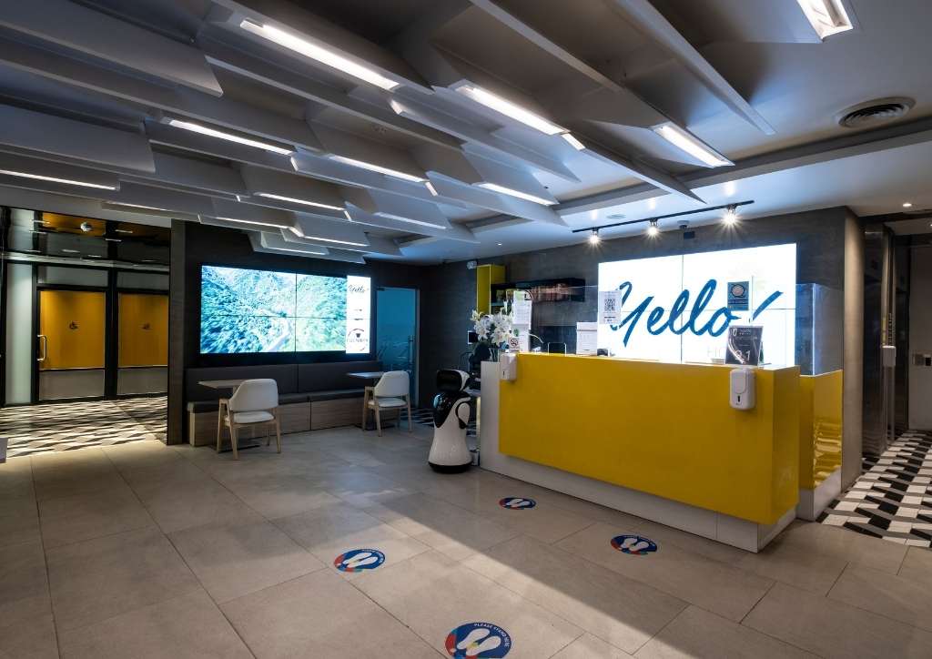 Entering Yello Hotel, a solid yellow plant box integrated into the voluminous canopy at the main entrance vibrantly greets its guests. Moreover, the driveway entry gives a continuous feeling of the facade with its planar take on the skewed canopies that gradually incline towards the lobby. The ceiling then inverts its direction at the lobby creating another three-dimensional element with the same sequence as the facade. The play of these elements, from the facade towards the ceiling, creates a connection towards the spaces. “Everything is always a coherent design element. We wanted the driveway to be still part of the hotel experience, connecting towards the lobby and towards the rooms,” adds Sia.