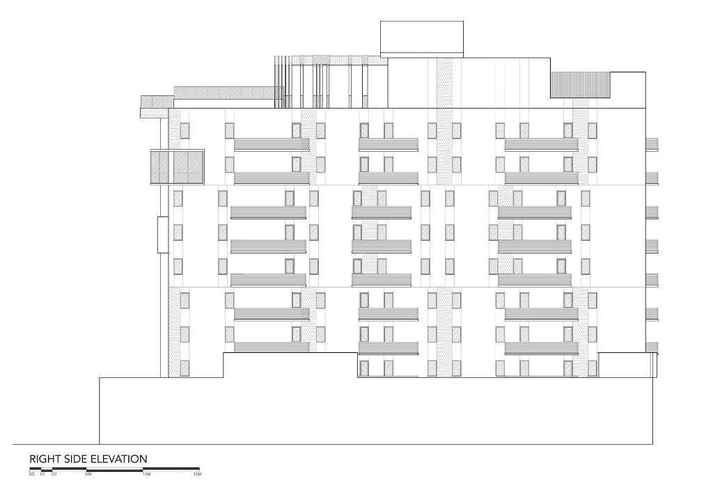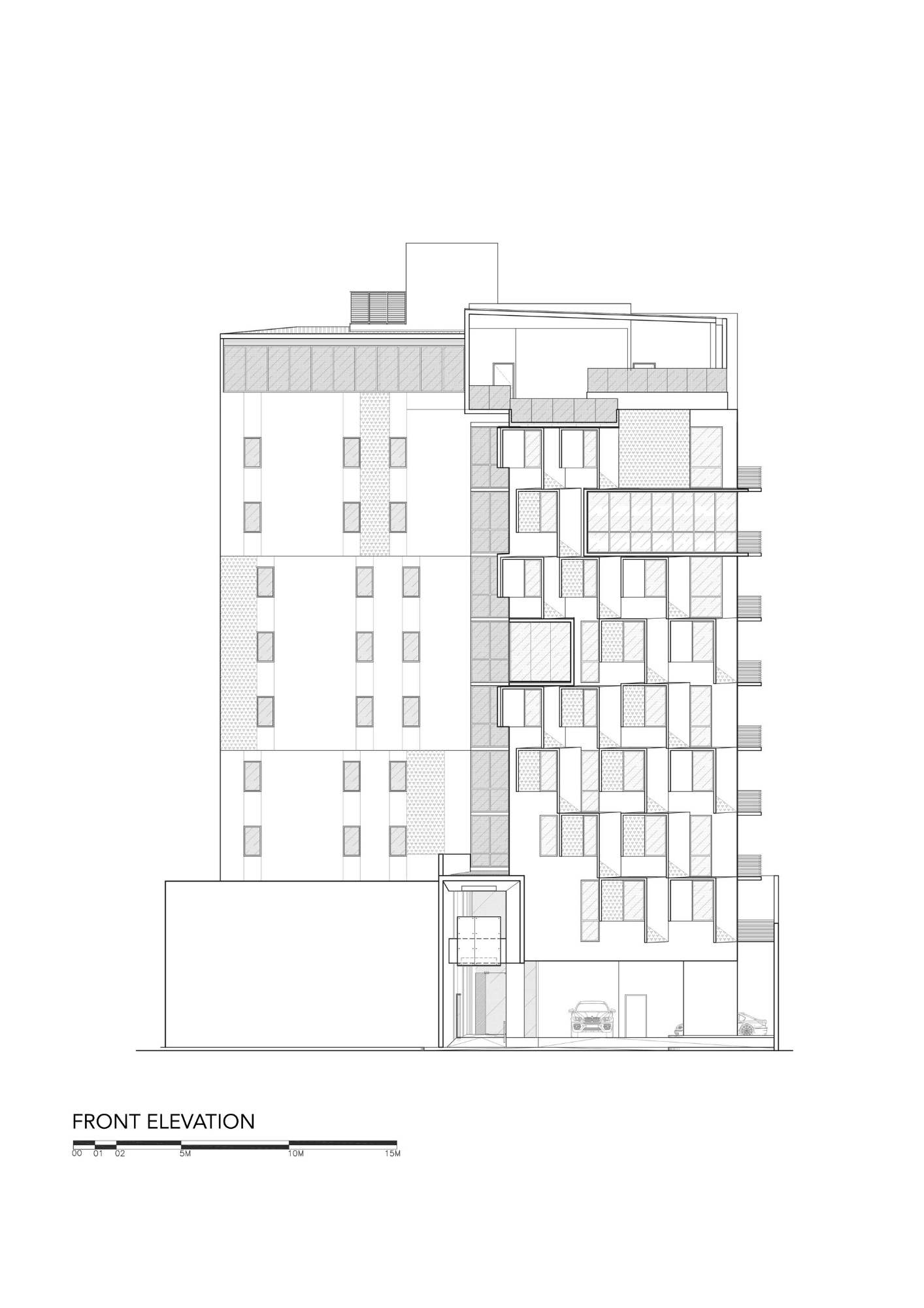 From the outside, the skewed canopies in a dynamic pattern draw the viewer’s eyes. From the ground all the way up to the floating boxes on the upper floors. The design element of an inverted J-shaped concrete forms the canopies. This creates a distorted sun shading that peeks towards the windows at the front. Creatively placed are these canopies with a cadence on the eyes, drawing attention to the protruding boxes which hold the amenities of the hotel. These canopies and the floating boxes not only give identity to the building but also add dimension and character to the straightforward plan and configuration of the hotel.