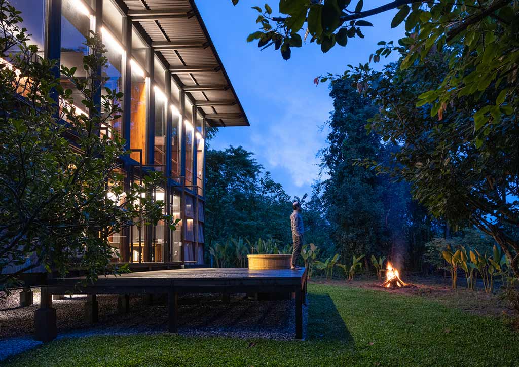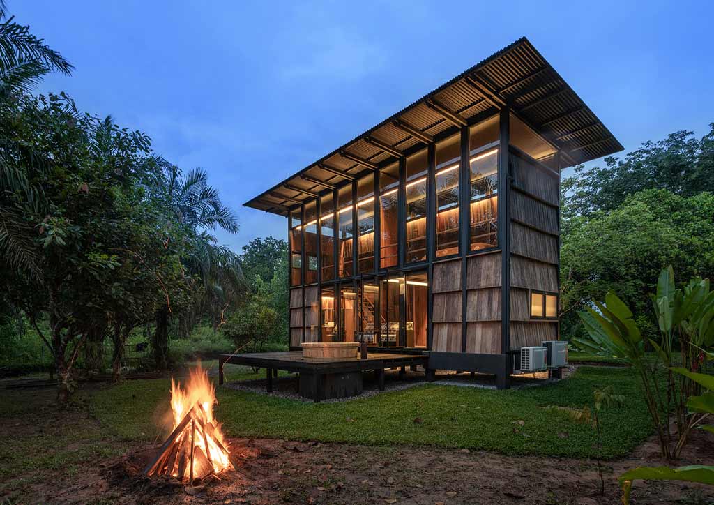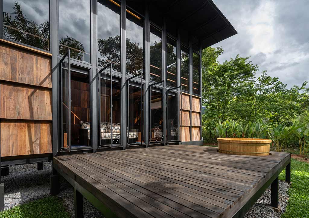The Wood and Mountain cabin’s design is as straightforward as the wooden structures and wall systems found in northern Thailand. Its exterior is made with neat cladding made of locally sourced wood and brings privacy from all sides except one which has an extension of the wall to ceiling windows to provide views of the mountains.