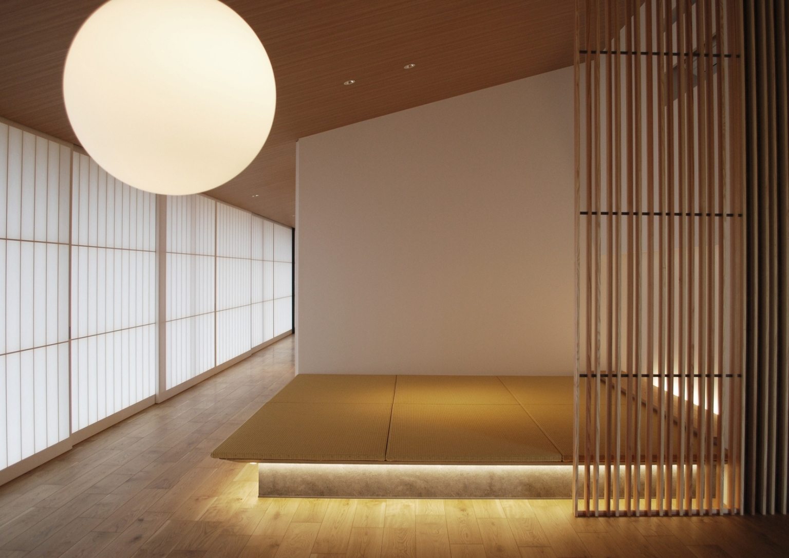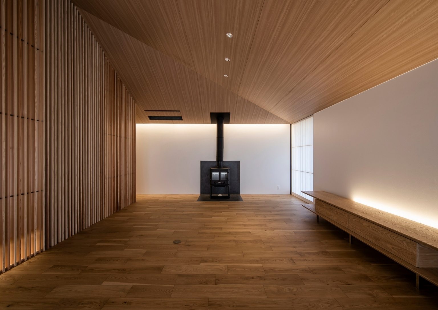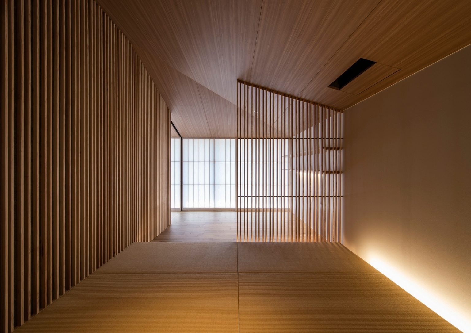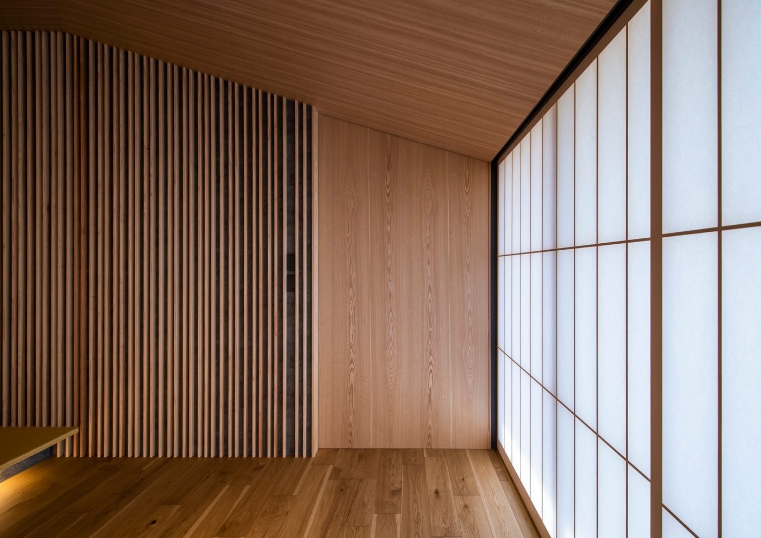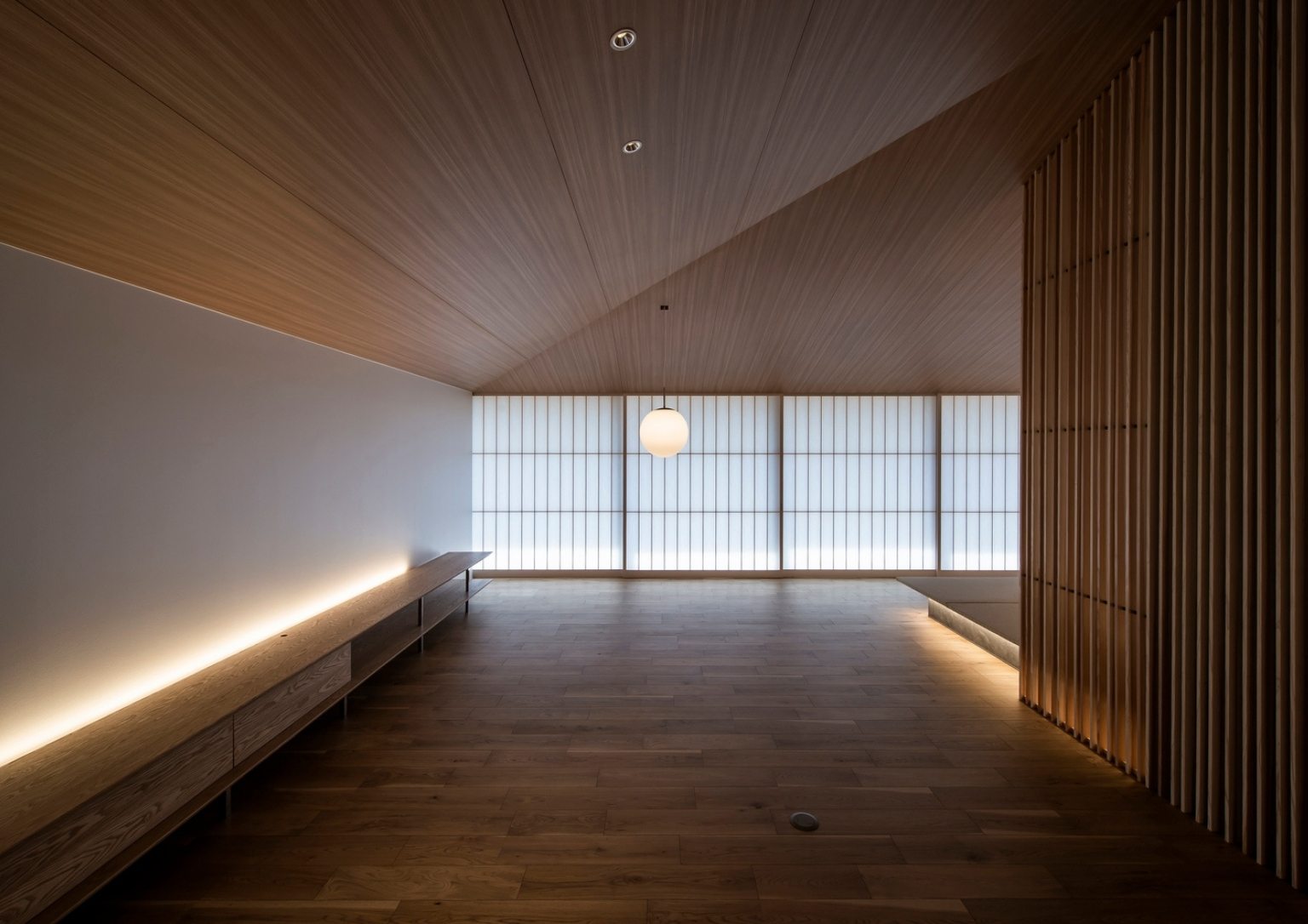Soft gradation of light surrounds the room from the vertical cedar latticework and Japanese paper-wrapped shoji screens. The interior features sloping ceiling panels of the same wood grain style with heights from 1,900 to 3,700 covering the entire plane. This creates places of different characters according to the height of the floor and connects them.