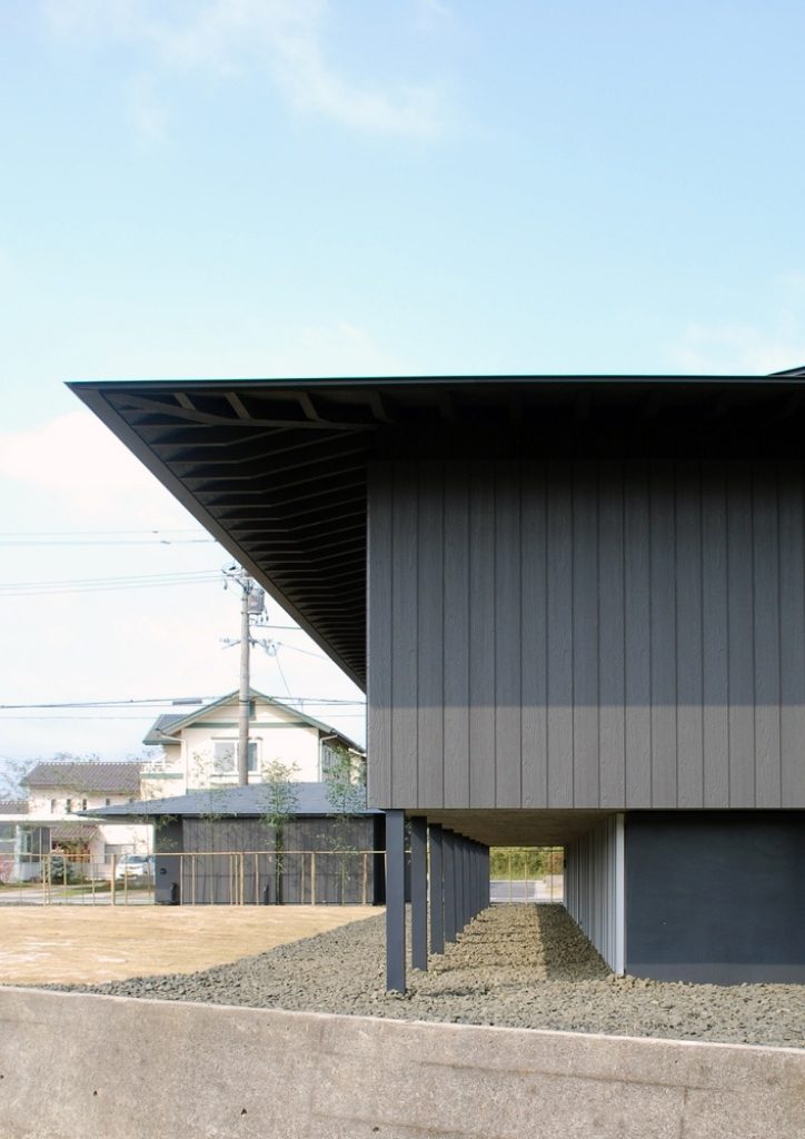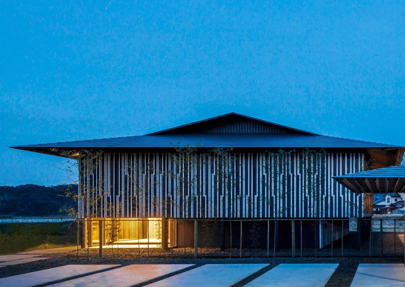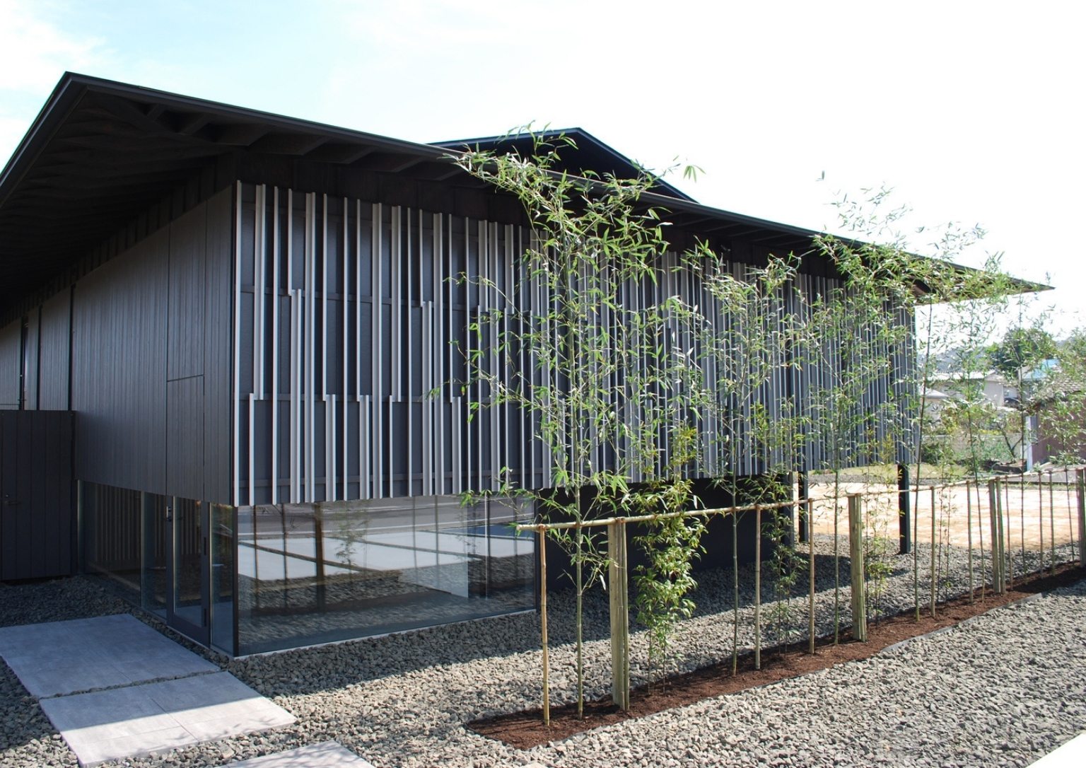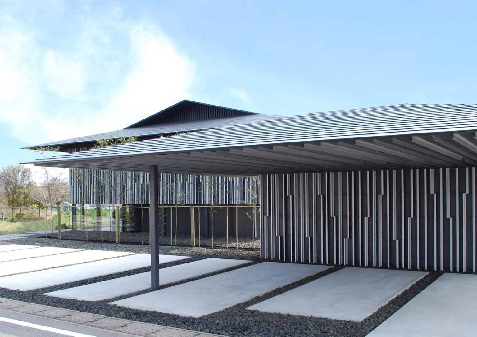Since ancient times, the land has been a reed field. To address the problem, Makido Architects created a vertical grid, replacing the unique rustling of reeds, bamboo, and rice with generic man-made objects. They also eliminated formal Japanese elements to achieve their goal of creating the appearance of a series of vertical grids in the shade of deep eaves.