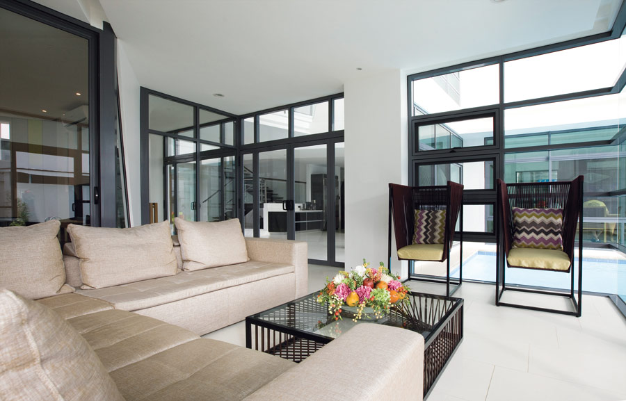 The house’s distinguishing features are its whitewashed concrete cubes interspersed with glass curtain walls, and floor-to-ceiling glass windows