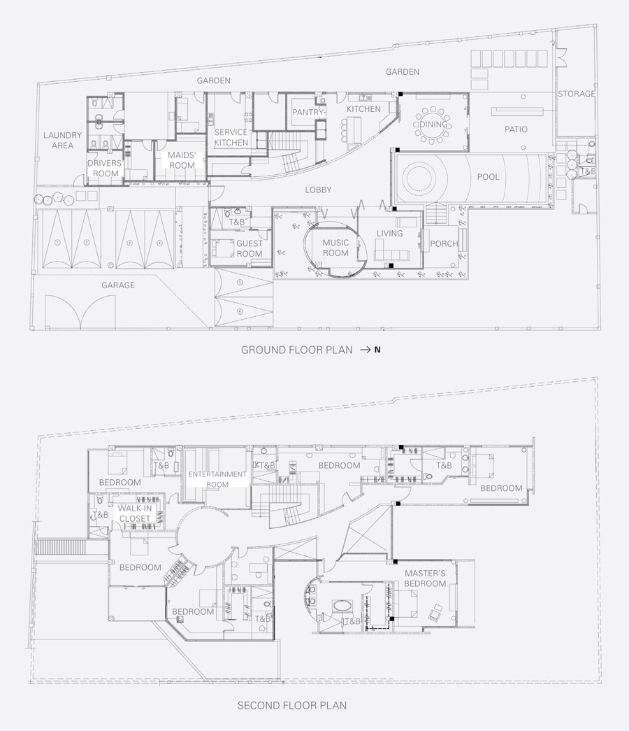 The curved cantilever is anchored to the structure via a circular sala that forms a “head” in the southern half, and provides the fulcrum around which spatial distribution is organized conceptually in the second storey. The circular sala has six doorways, all leading to the six “junior sibling” bedrooms. In terms of motifs, this circular space is repeated at the ground floor music room, which is an oval-shaped space tucked behind the altar room, and just to one side of the living room. The meandering curve of a ceiling cornice follows the curved cantilever bridge from the circular sala into the conceptual “head” of the house: the master bedroom.