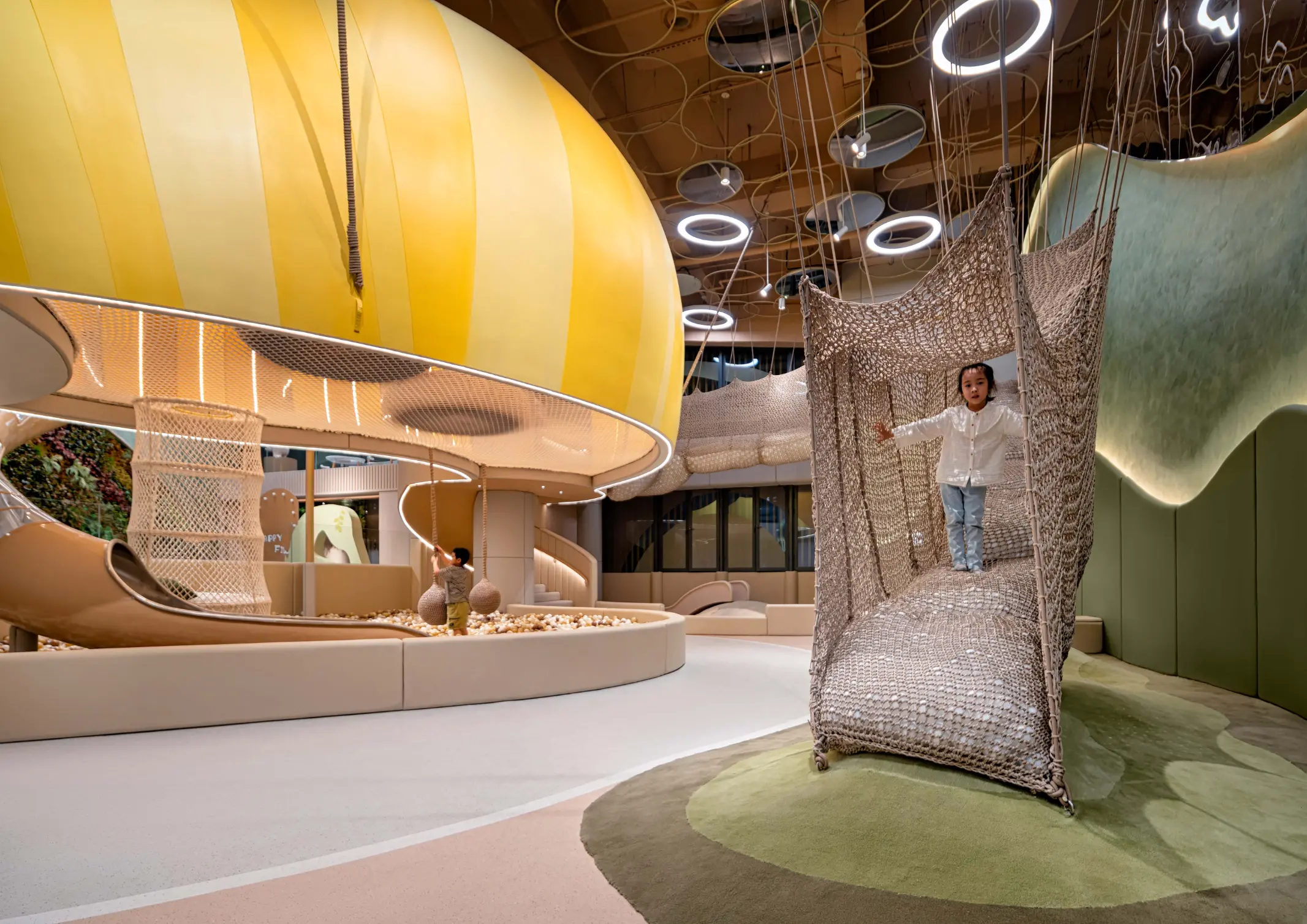 Thirdly, the Autumn Leaf is designated as the anti-gravity zone, distinguished by a suspended, orange leaf-shaped structure. It incorporates a rope array and a trampoline, providing a semi-enclosed environment perfectly suited for activities such as hide-and-seek and participation in anti-gravity exercises like rope climbing and trampolining.