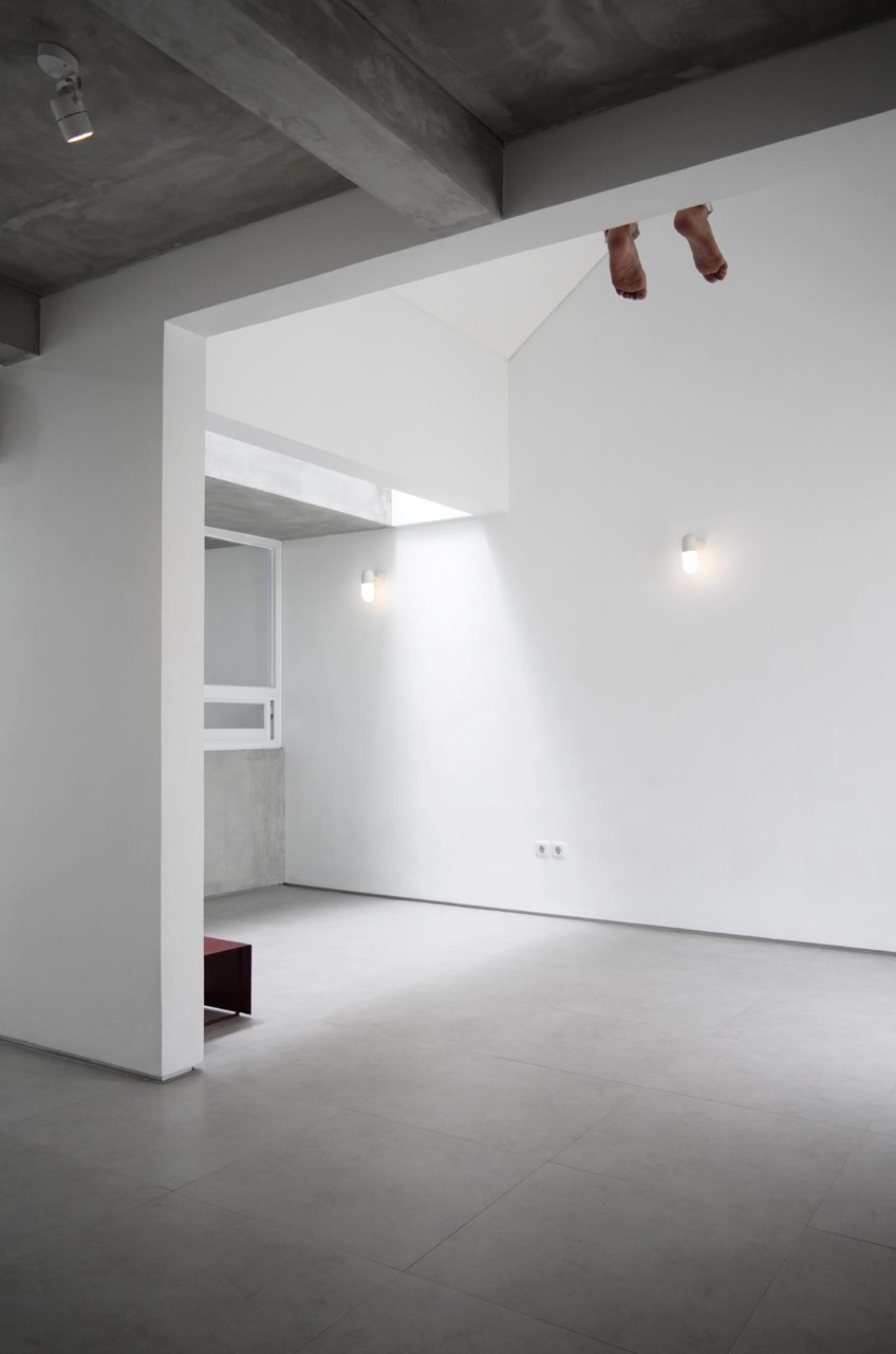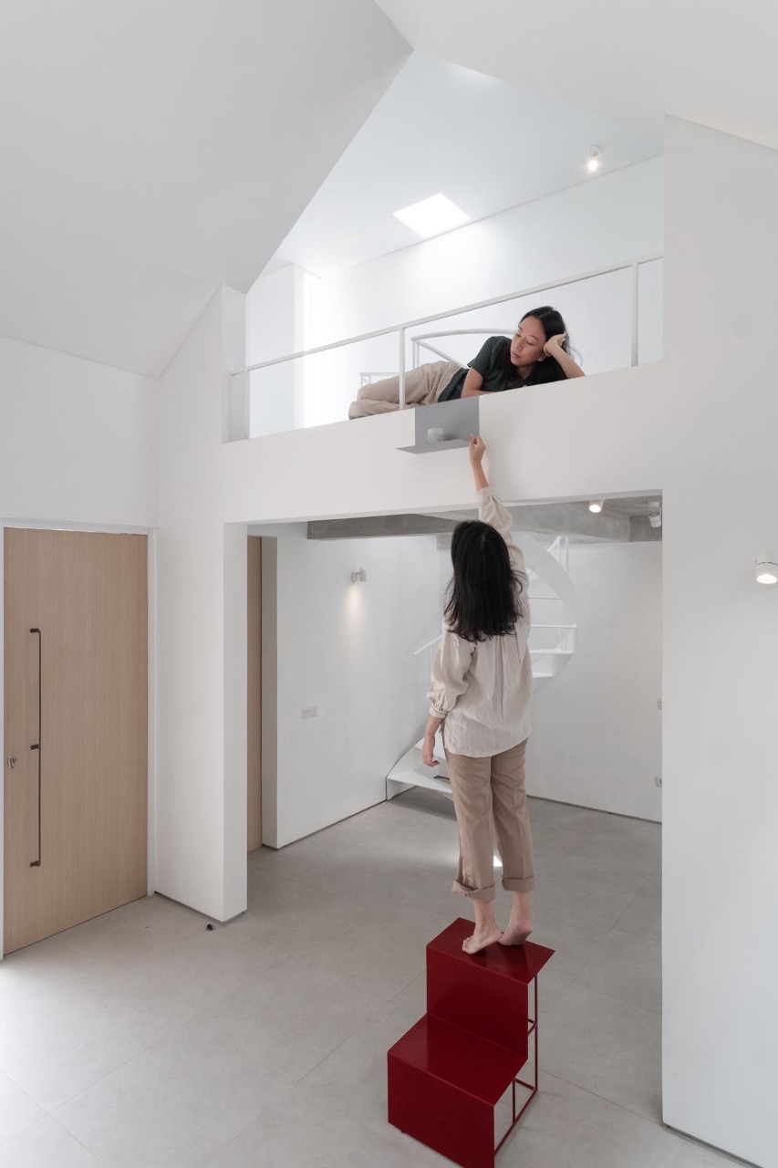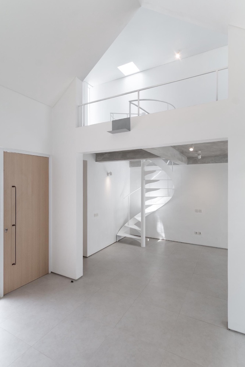 Built-in storage and shelving further frees up floor space. Minimal furnishing and decor is used to create f lightness and airiness. The addition of clerestory windows in key locations further compounds this effect. The staircase also subscribe to this motif with its spiral freestanding design and open treads.