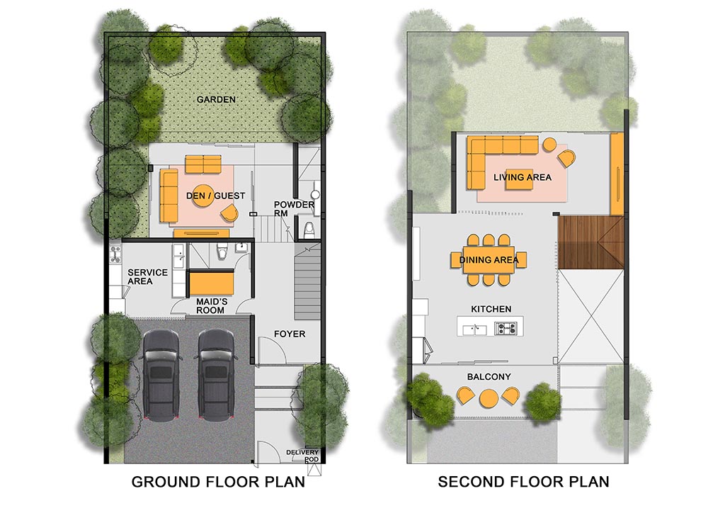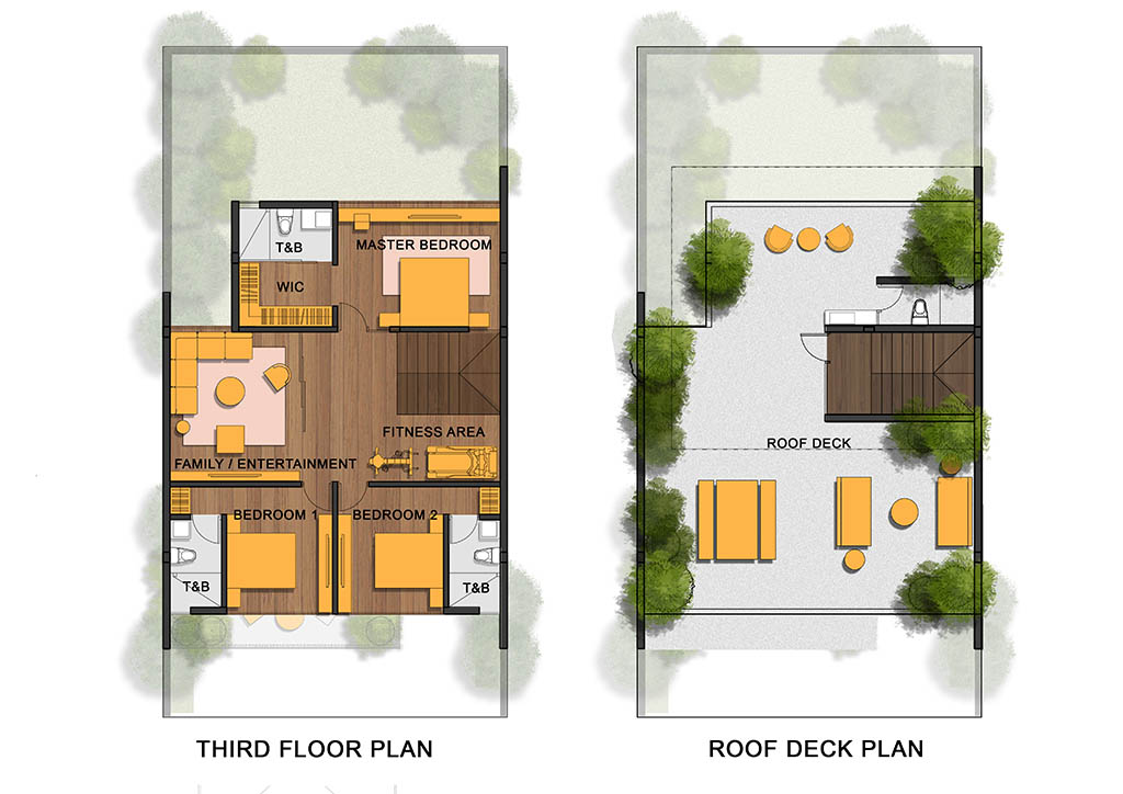 The ground floor, inspired by the kubo’s silong, houses spaces for services and utilities. Living areas on second floor include a balcony and sun deck, and a dumbwaiter for transferring items with minimal contact. It can also double as a quarantine area if needed. Bedrooms are on the third floor, with large windows for natural lighting and cross-ventilation. A roof deck acts as a private outdoor oasis.
