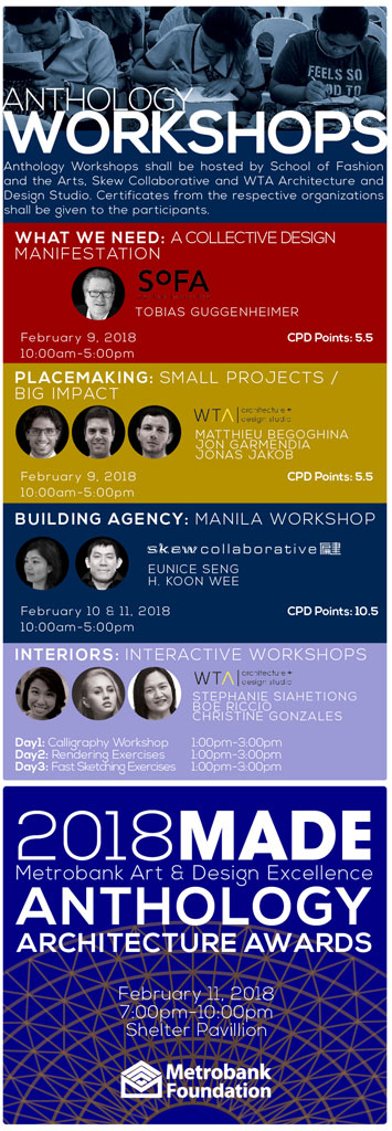Launching this year is the 2018 Metrobank Art & Design Excellence (MADE) Anthology Architecture Awards that showcases the year’s best architecture. Its mission is to increase awareness about architecture and promote a more meaningful architecture that creates a more positive social impact. The MADE Anthology Awards are presented by the Metrobank Foundation and Anthology Festival in partnership with the United Architects of the Philippines, the National Commission for Culture and the Arts, and the Cultural Center of the Philippines.