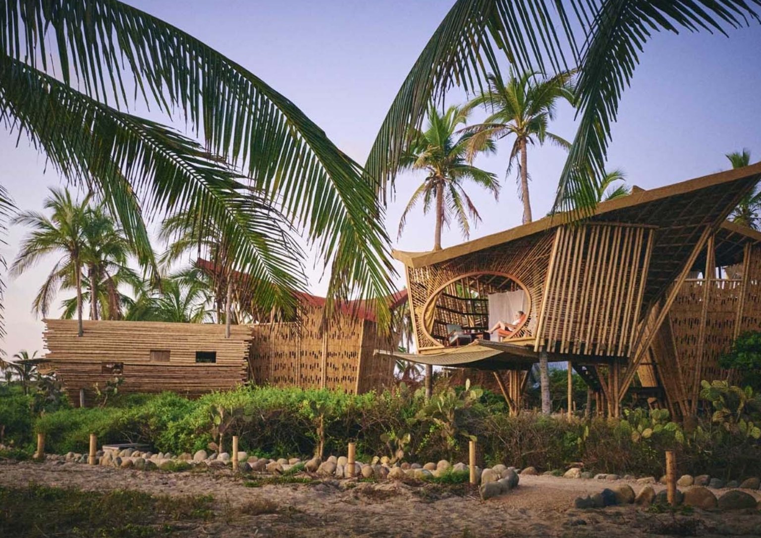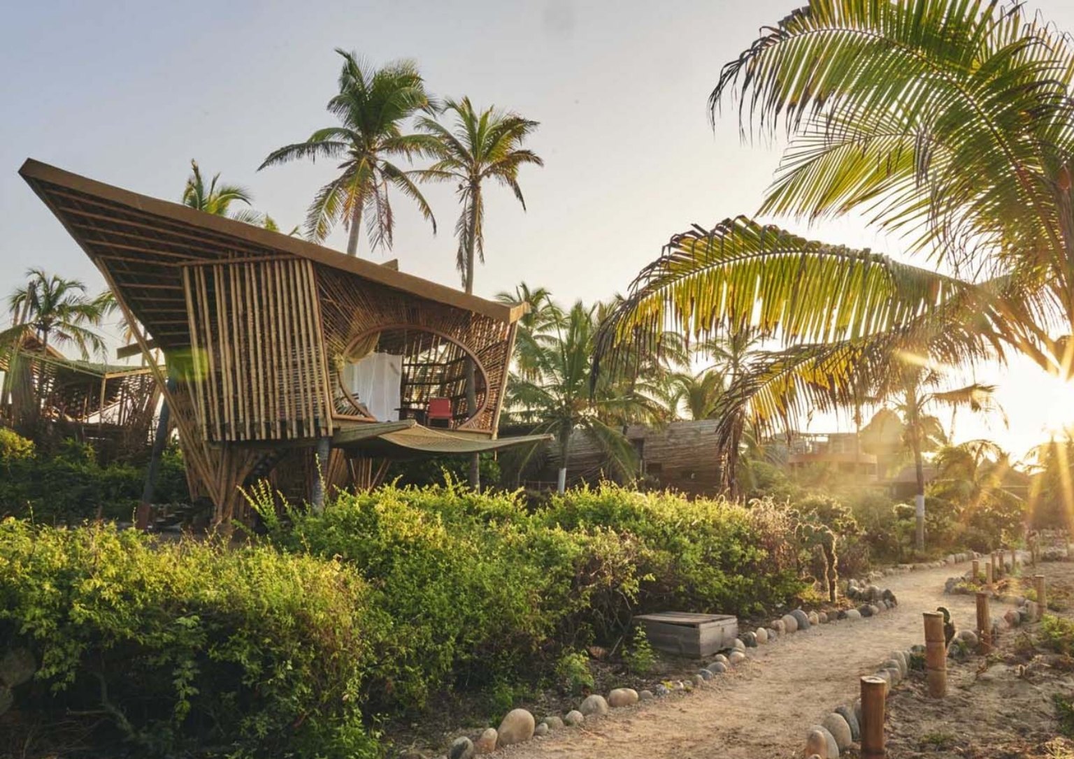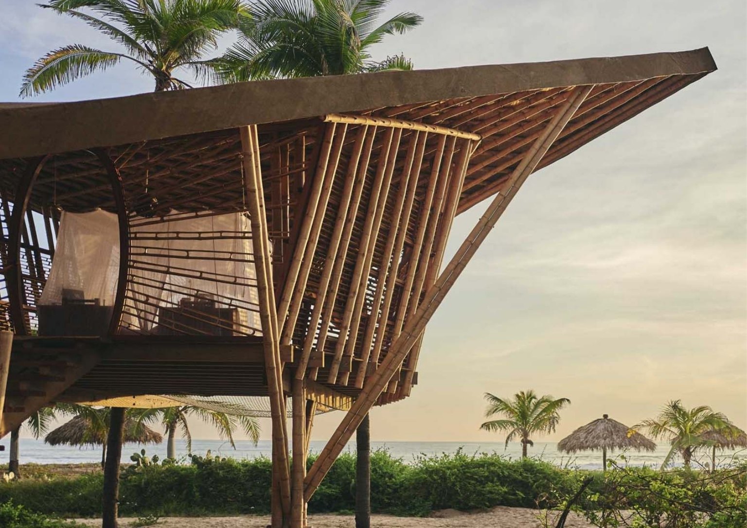 The Mobula Rays that inhabit the property’s coastline served as the inspiration for the overall design. The six bamboo treehouses have flat diagonal roofs bringing to mind the shape of the beautiful aquatic creature.