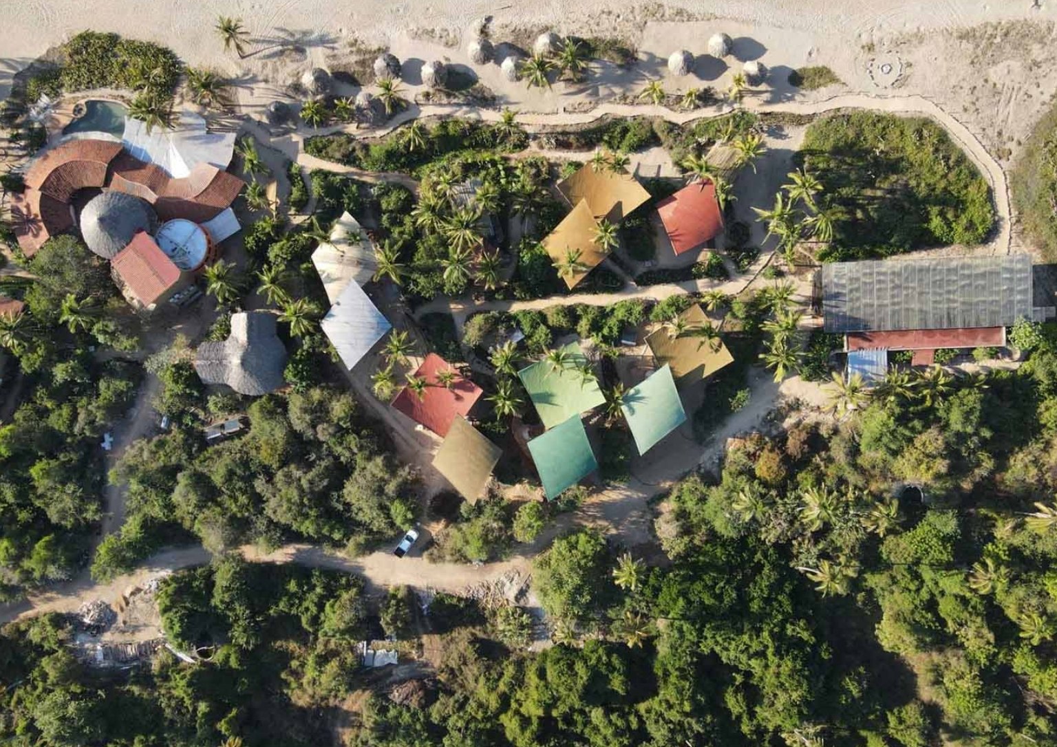 All of the treehouses are above the ground. Each has its own annex where the lounge or the second bedroom is. Below the annex treehouse is the bathroom. Lush coconut trees surround all of these while overlooking the Playa Viva beach. The carefully curated spaces will take patrons into a relaxed tropical paradise.
