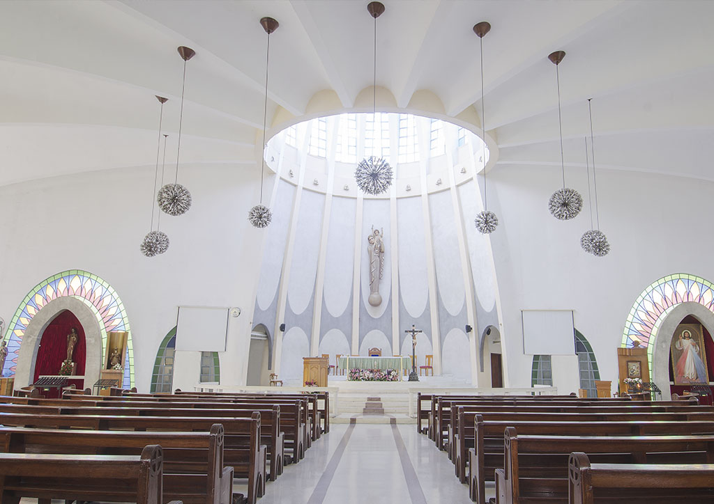 Designed by Architect Eduardo Uychiat and its present structure built from 1964-1966, the Our Lady Queen of Peace Parish was designed to look like a crown. Natural light from the dome above the altar illuminates the church. The dome is composed of narrow, arched stained-glass windows arranged in a circular manner, similar to the arches that make up the main structure.