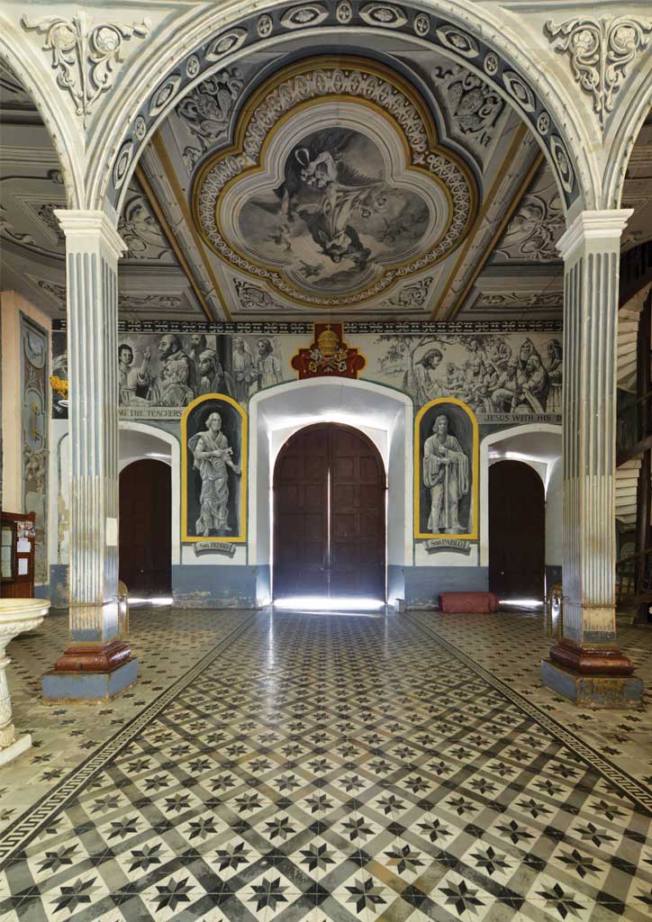 At the base of the domed ceiling are the words of Christ’s commission to his followers, written in Latin and translated in Tagalog: Euntes ergo docete omnes gentes baptizantes eos in nomine Patris et Filii at Spiritus Sancti (Go, therefore, and make disciples of all nations, baptizing them in the name of the Father and of theSon and of the Holy Spirit).