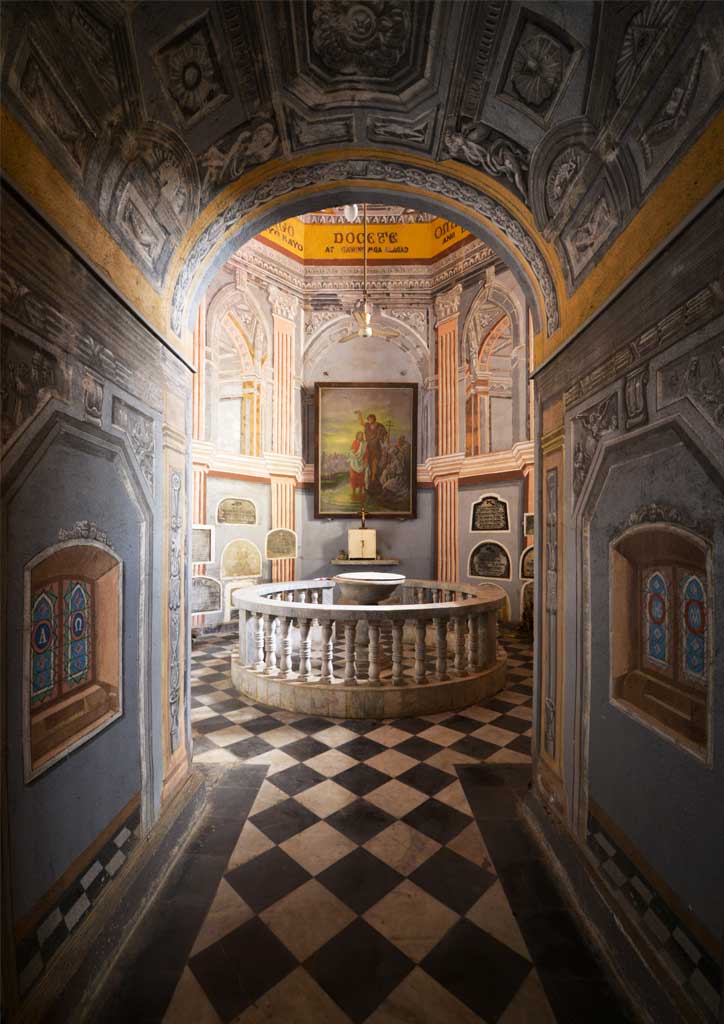 The baptistery is located inside the belfry tower, adjacent and attached to the church by a short passageway. In the center of the room is a round baptismal font of marble. Within the surrounding walls are shallow niches containing the remains of departed parishioners.