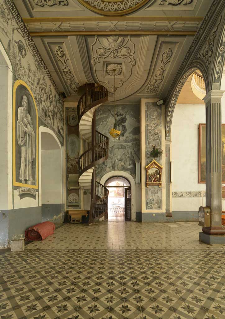 To the right of the staircase spiraling up to the choir loft is the doorway leading to the baptistery. Baptisteries were traditionally located near the entrance/narthex, to symbolize the entry of the newly baptized member into the church.