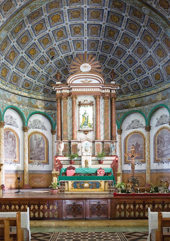 In contrast with the bland cement façade, the church interiors are striking for the well-preserved state of the trompe l’oeil paintings and details for the ceilings, arches and columns. Painted scenes from the Bible grace the sidewalls, which feature painted shadows and frames to create a three-dimensional sense of depth and relief.