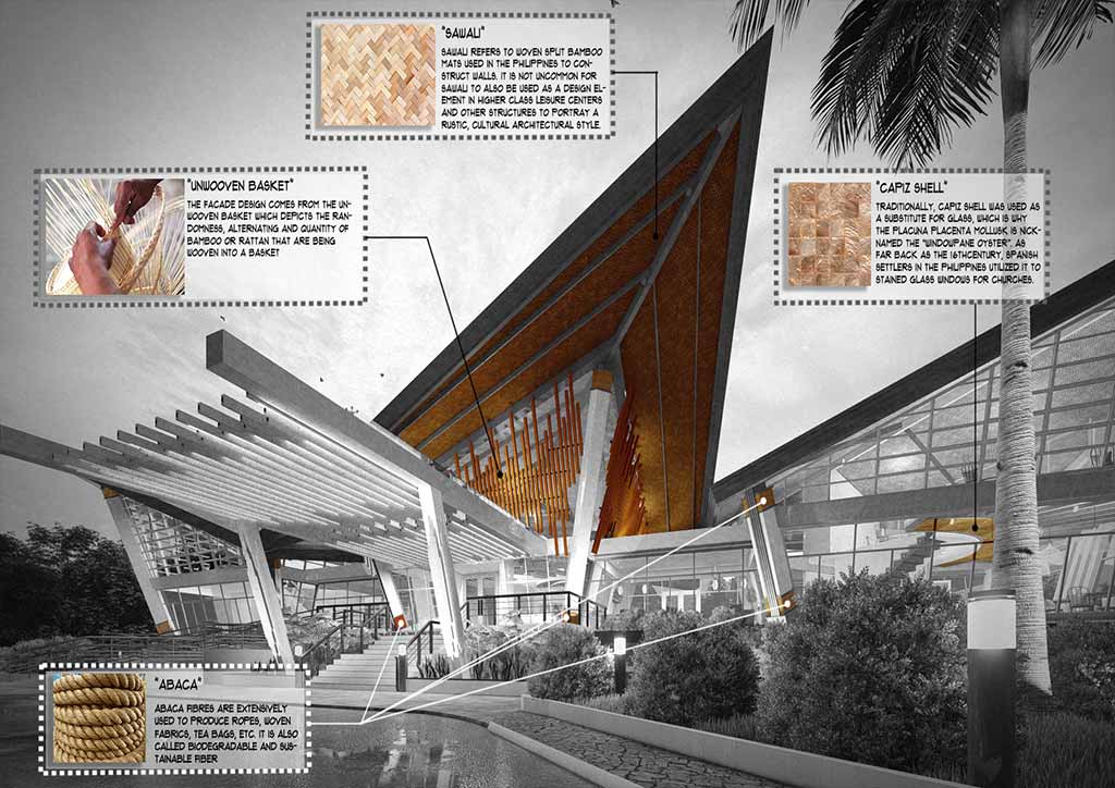 Our country has a long and rich tradition of producing handicrafts made of indigenous materials. These handicrafts often have cultural value; thus, they are important to the tradition of some local communities and tribes. Through the use of indigenous materials known to our ancestors, such as seashells (capiz), weaved bamboo sheets (sawali), plastic weaved (solihiya), and other locally-sourced materials, the boutique resort has showcased an important part of our cultural heritage. It includes as well in the representation the local artisans who are assembling “The Unfinished Basket” in the Architecture Boutique Resort Complex.