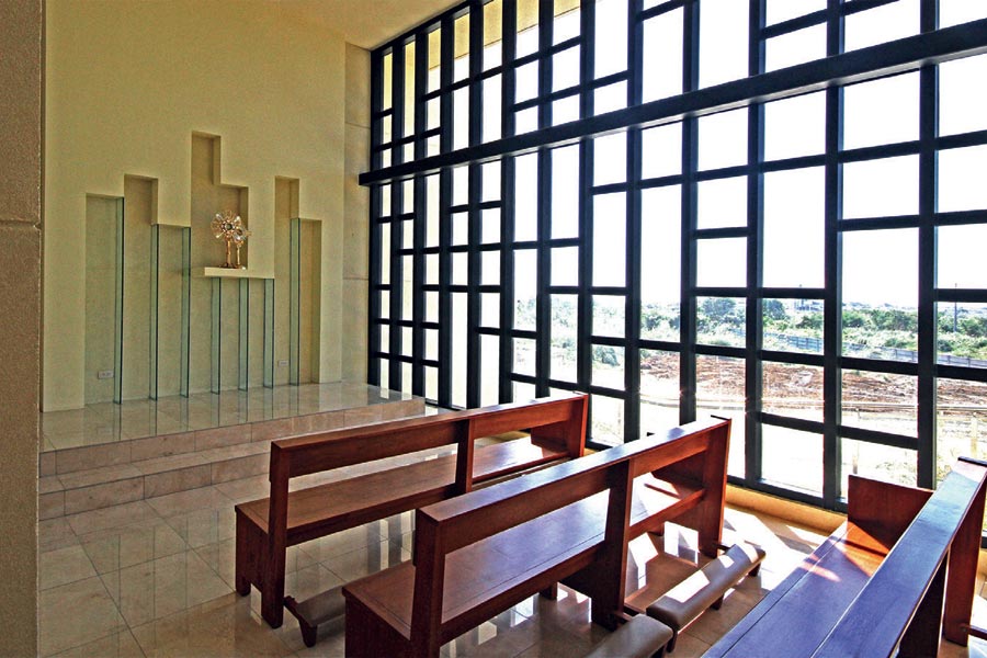 The finishes in the interior were meant to be in Mactan stone, but after finding out that further quarrying would compromise the environment of the province, the designer opted for a faux Mactan stone finish. Beyond these, everything else is non-traditional. There is a chancel and sanctuary area for the altar but there is no communion railing. There is no retablo but three statues adorn an abstract treatment of glass fins on the altar wall. The statues—including St. Peter Calungsod’s—are disappointingly traditional, but apparently this is a temporary situation according to Arnaiz, who would prefer more avant-garde pieces.