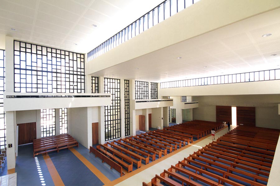 There is also a choir loft above the left transept, which is not unusual, although this is found in more contemporary churches. The main space of 4,000 square meters is not very tall but verticality—which leads the eye upward like Gothic cathedrals—is implied with the many walls and the glazing between them. There is a traditional nave, which divides the congregation in two. The pews are of solid wood in a restrained design that blends with the space.