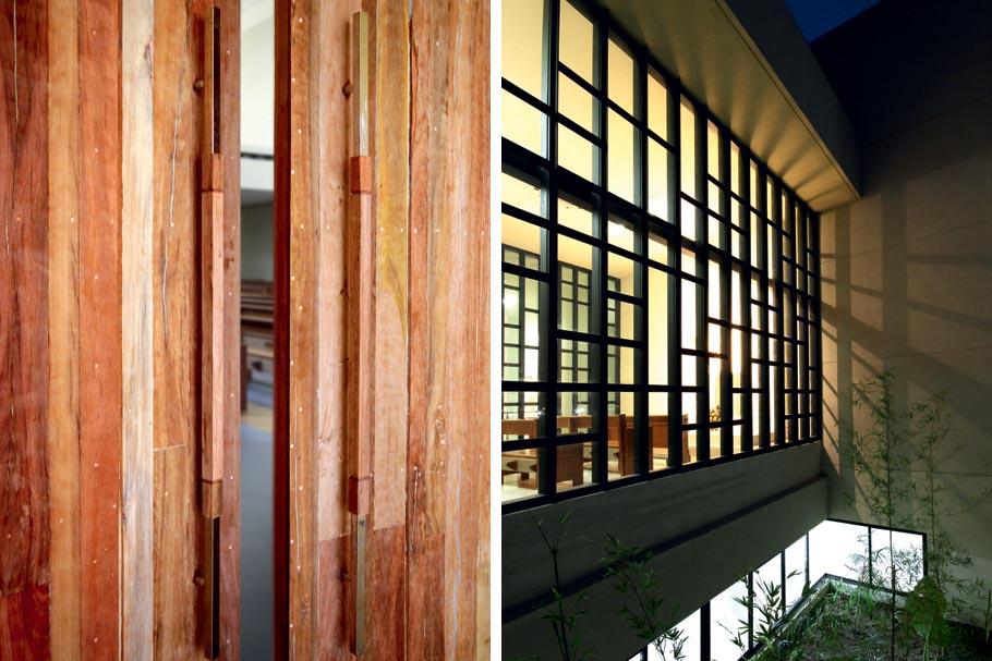 Only at arrival do you see the portal to spaces inside—massive top-hung doors made from salvaged wood. An earlier scheme of the architect showed a tower, but this was replaced by a simple cross, attached to the façade. The structure has also been called “The Church of 100 Walls.” The intent, says the designer, was to reflect the diversity of “society today, along with the different ways modern Catholics take to access God and involve themselves with other faithful.”