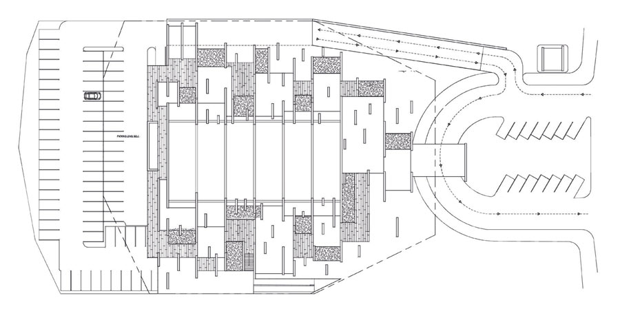 Arnaiz and his New-York based firm, CAZA, quickly developed schemes for a larger structure to seat a congregation of 800. The half-hectare site chosen by the complex’s master planner was east of the water’s edge. It needed to be elevated above the flood line of the adjoining channel. This gave the architect the opportunity for additional back-of-house spaces and meeting rooms that he placed below the main floor.