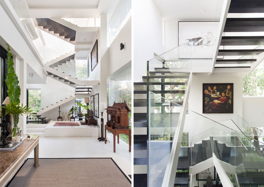 (Left) The sumptuous open space of the stairwell to the other side of the reception hall features a centilevered span, with a gentler rise that easy on the legs, and treaded by mahogany. Perhaps the most Modernist element of the C House, its transparent balustrade keeps things light and elegant. (Right) The transparent balustrade affords unhampered views of the stairwell, with its various artworks that give a museum feel.