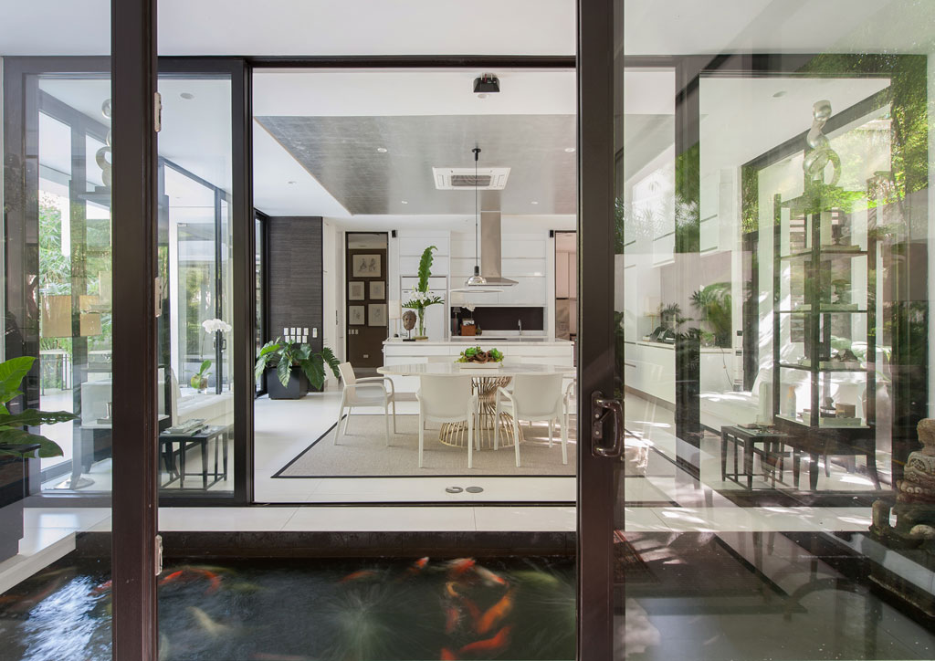 View of the breakfast nook from the dining room, separated by an air corridor, and planted with a koi pond to provide serene sounds of water and life, and give the owners their daily ritual of feeding the carp after breakfast.