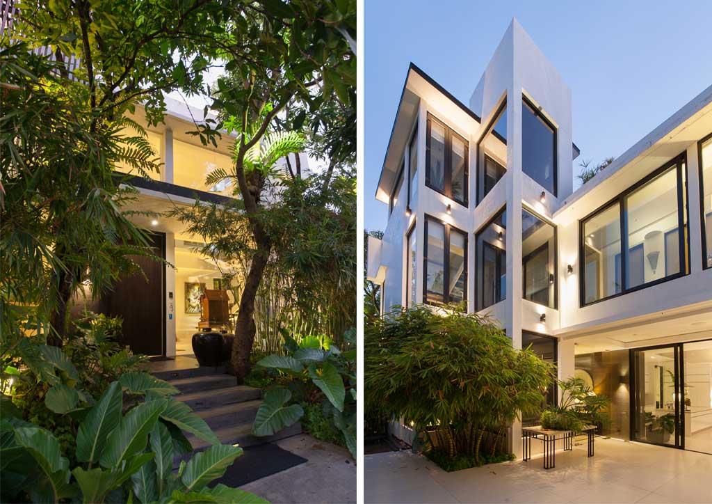 (Left) The arboreal foyer of the C House, highlighted by the mahogany full height main door by Cebu-based Evin Oshima of TALA. (Right) Courtyard of the C House, here dominated by the stairwell and scenic elevator shaft that brings guests up all the way to the third floor garden deck (partially seen to the upper right). Bamboo plantings by landscape architect Ponce Veridiano contrasts with the cubical Modernist white palette of Onglao’s structure to give an overall Asian resort feel.