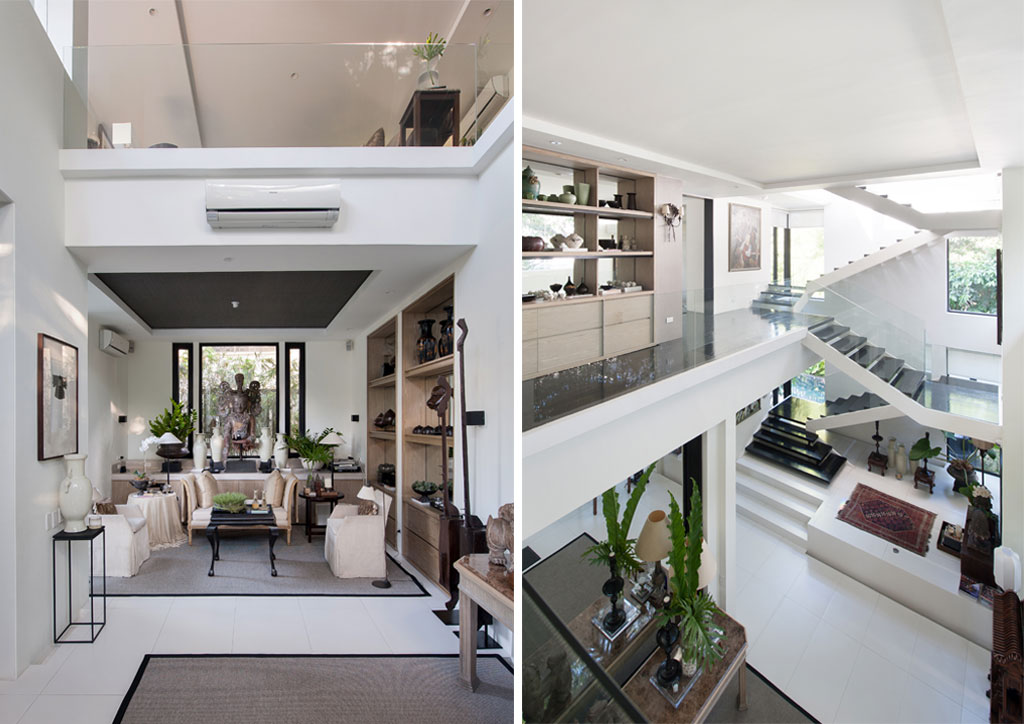 (Left) In the reception hall, the owner’s antique collection of celadon vases, Minadanao spinning tops, and an antique Buddha bring a sumptuous feel of oriental grandeur. The balcony overhead leads into the entertainment nook just above the reception area. (Right) Second floor balcony view of the stairwell. Onglao’s interiors focus on a palette of whites and light tans to give emphasis to the owner’s antiques and art collection, framing them like accent pieces to an overall space, and giving a house a more “lived in” feel. Tropical plants situate this feeling in an Asian space.