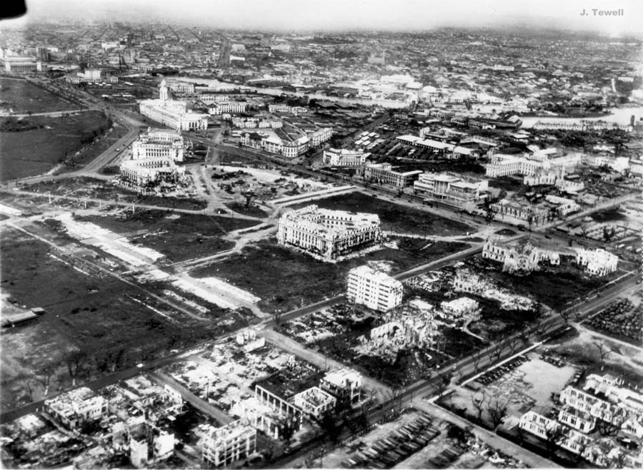 War wreckage scars government section of Manila, Philippines, Feb. 1, 1946. Written on this photograph is: “Manila one year after Yanks re-entered. War wreckage scars government section of Manila, Philippines, Feb. 1, 1946. Building in center with the large grounds is the Commerce Building; behind and left of it is the Finance Building, and just above the Finance Building is Legislature Building and City Hall is above the Legislature Building.” (AP Wirephoto) Image courtesy of John Tewell.