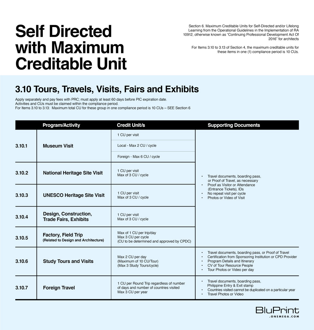 Under this provision, visiting design exhibits, museums, heritage sites, and even socio-civic work can merit points. So make sure to keep all your certificates, receipts, boarding passes, entrance tickets, and IDs in order to put them to good use.