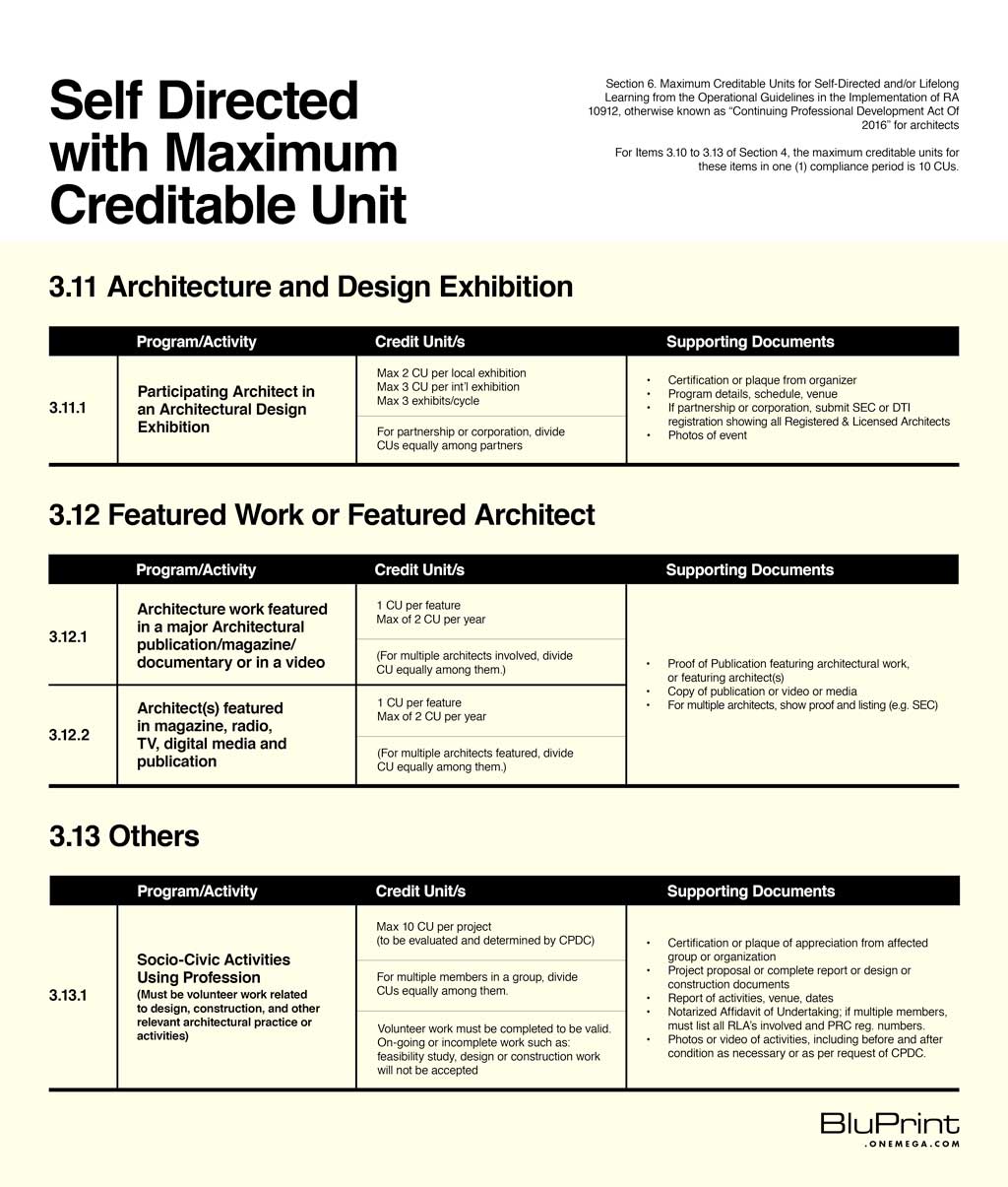 These guidelines identify activities under a Self-Directed Program matrix for points. These include “learning activities which did not undergo CPD accreditation but may be applied for and awarded CPD units by the CPD Council of Architecture.”