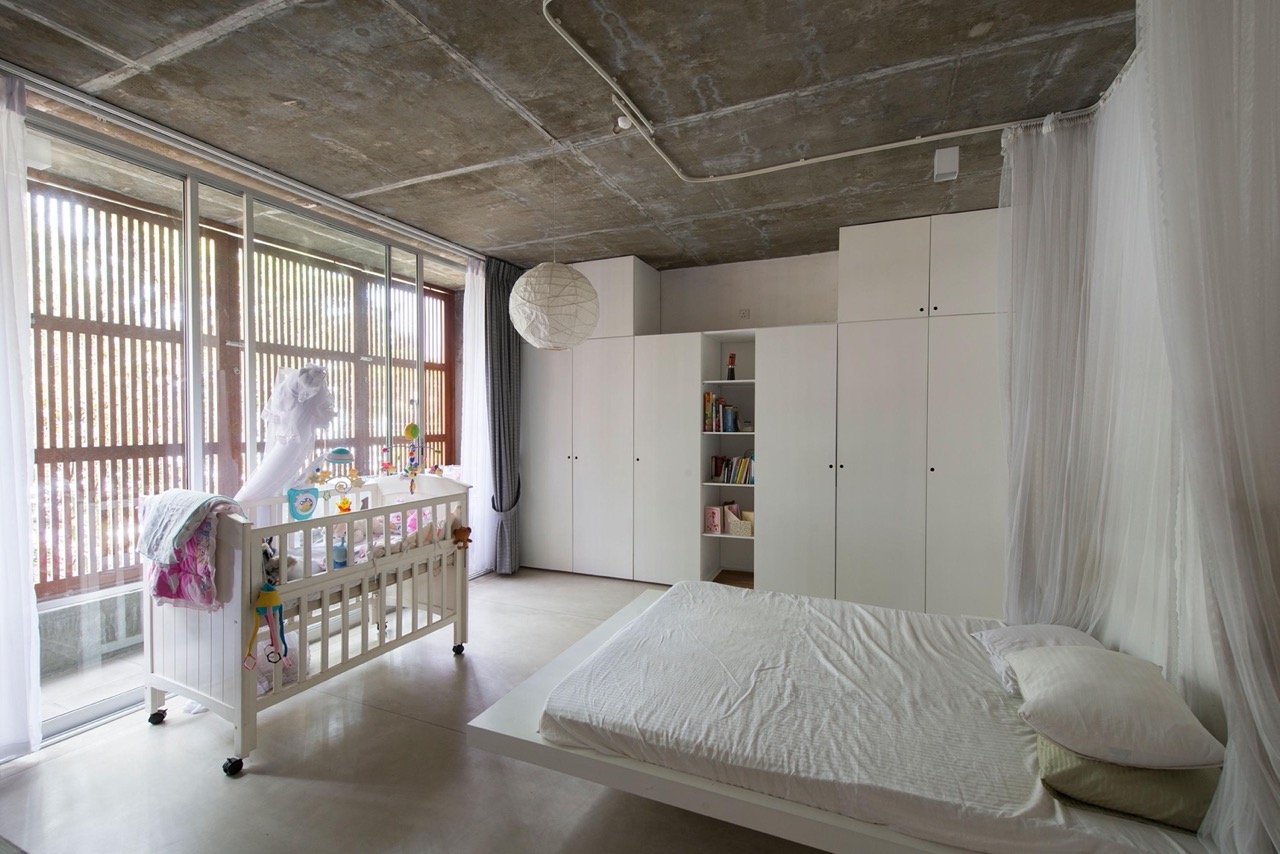 On the second floor, timber bridges wrap around the courtyard and the skylight above. It carefully frames the interior views that enhances the biophilic effect while also making way for a more spacious feel. In more intimate areas, bedrooms feature plastered white walls that brightly contrast the common areas.