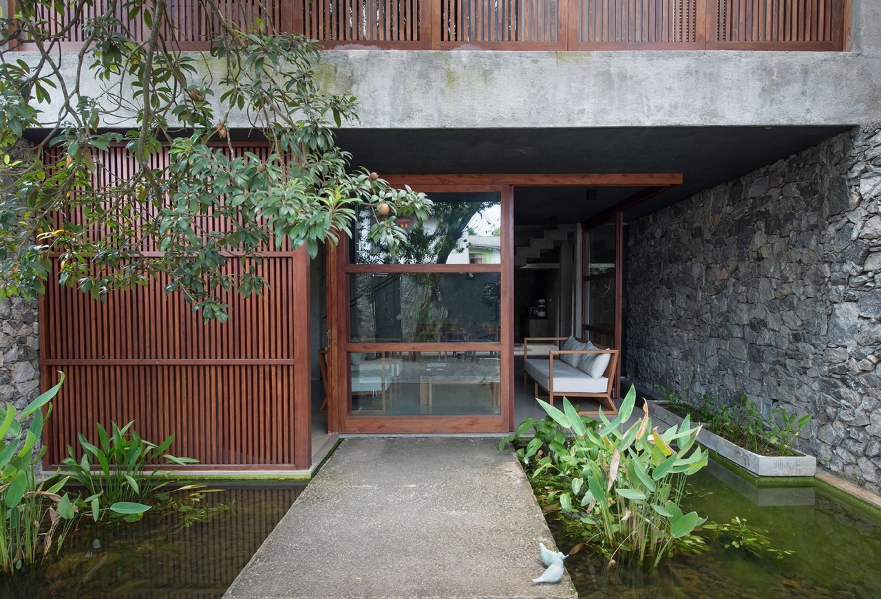 Its flat roof and clean lines express a contemporary aesthetic. An extensive use of natural materials like timber and stone grounds the design. Its porous facade features wide sliding glass doors, lattice screens, and open stairwells. A roof garden provides thermal buffering from the sun and also features rain harvesting features.