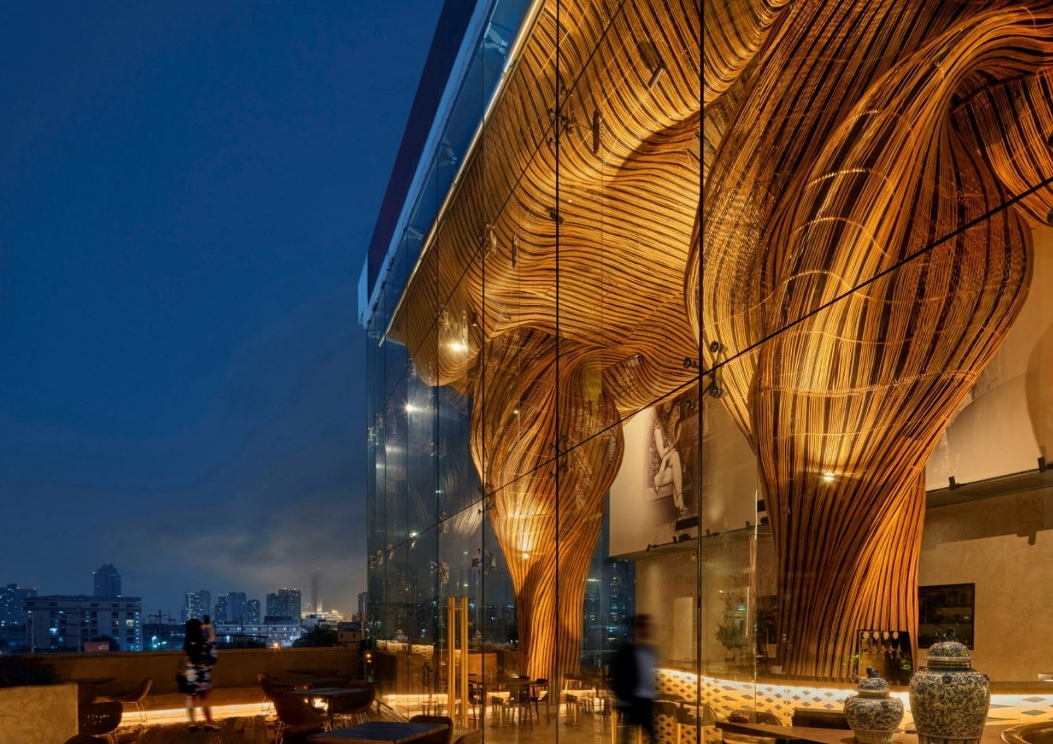 Agastropub in Bangkok Thailand grounds itself upon eco-awareness and innovation. Enter Projects Asia, an architectural firm based in Phuket, creates a meticulous rattan design installation that simulates the form of beer being poured. Spice & Barley’s intricate design continues up to the 30-meter-high ceiling creating a fluid geometric flood.