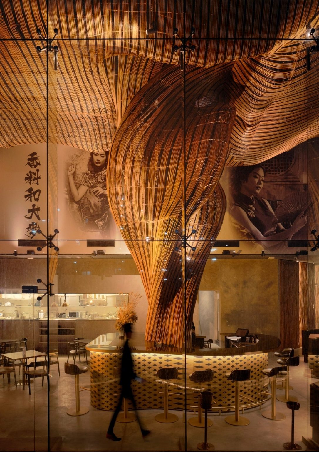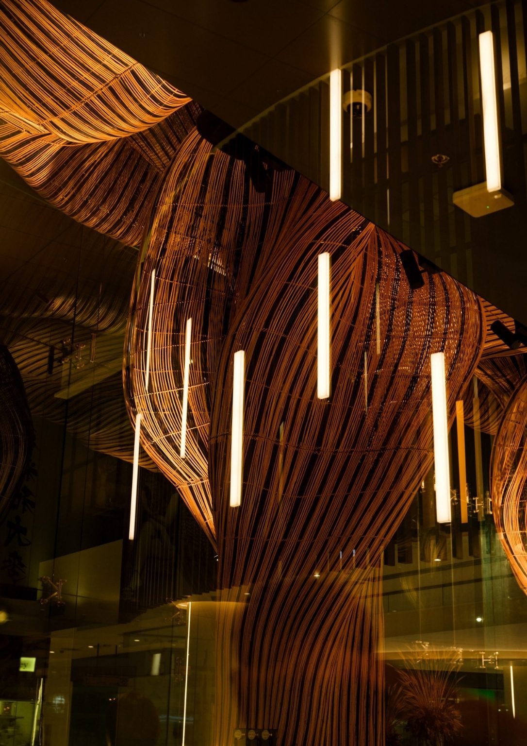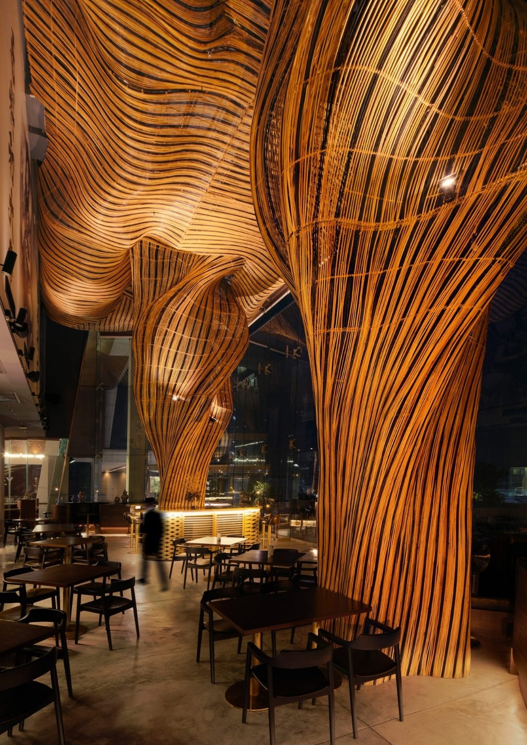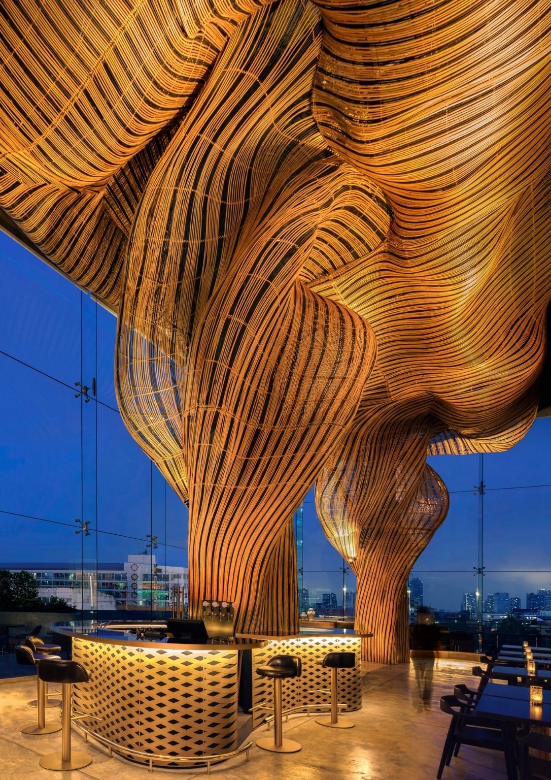 Two huge rattan pillars watch over the entire space. It imitates the skyscrapers that surround the vicinity. These traditional structures were created by using 3d special effect software to simulate fluidity. And then with marine technology software, the fabrication of special aluminum frames as support was made possible. Moreover, aside from the design function, the rattan also acts as a cover for the beer pipes, airconditioning tubes, and the like.