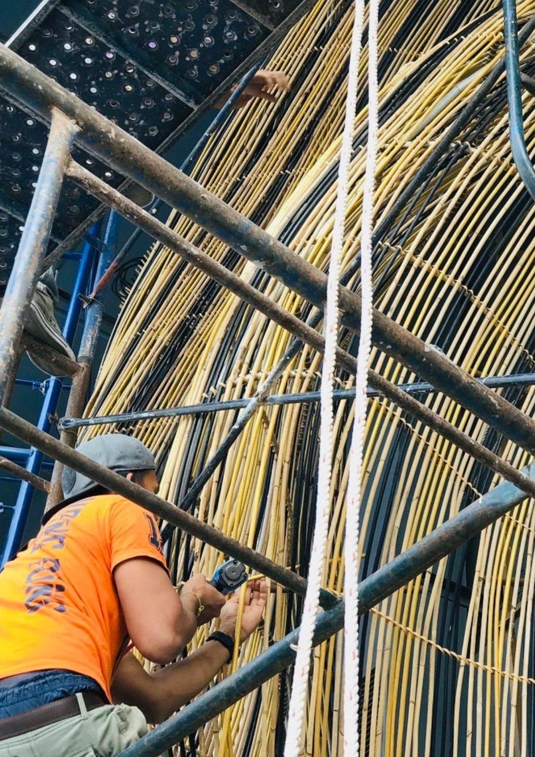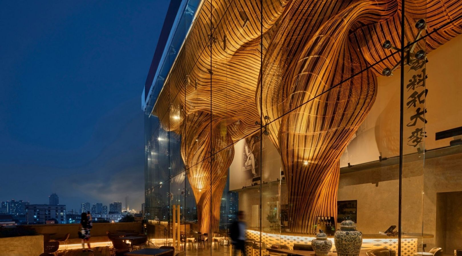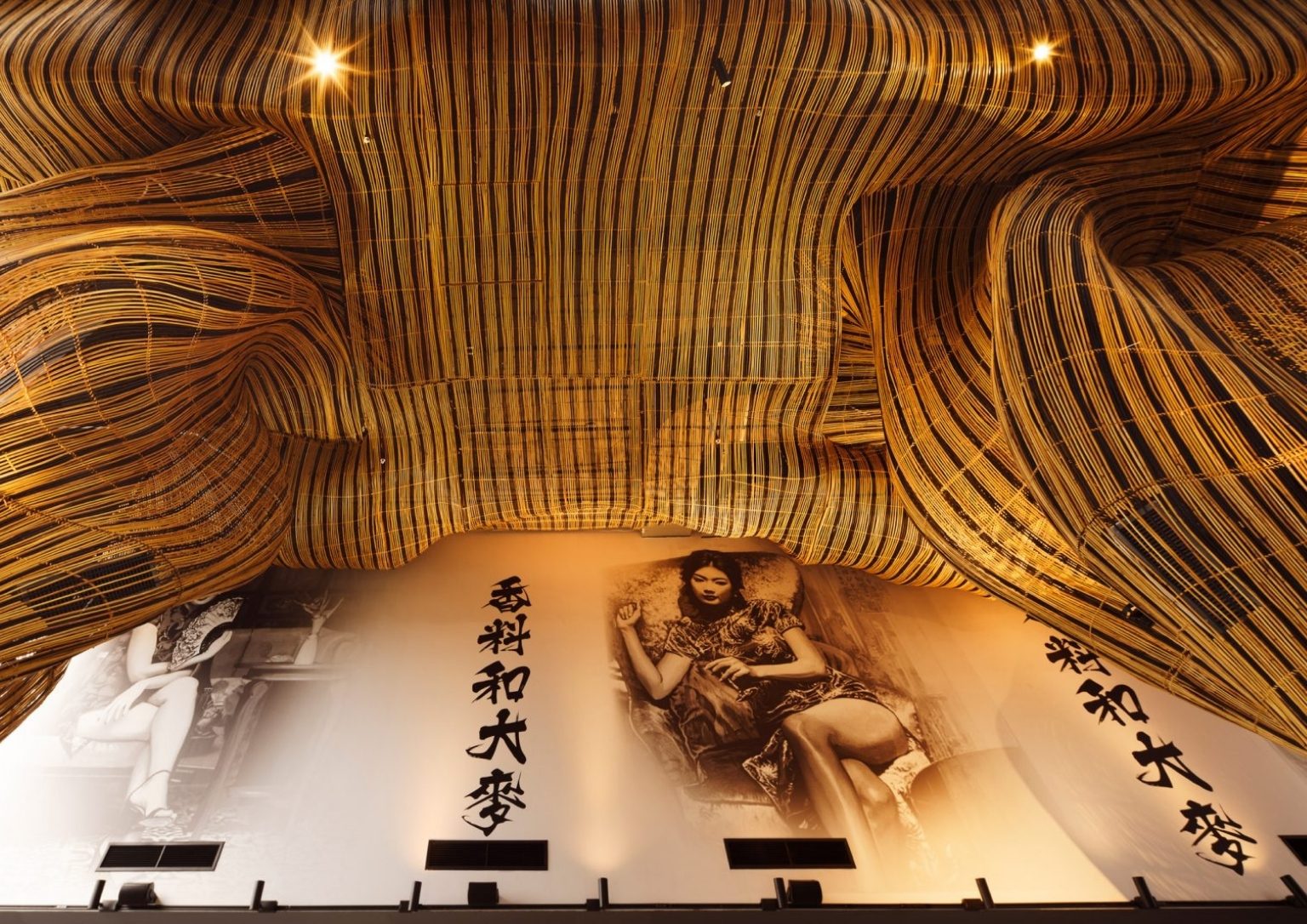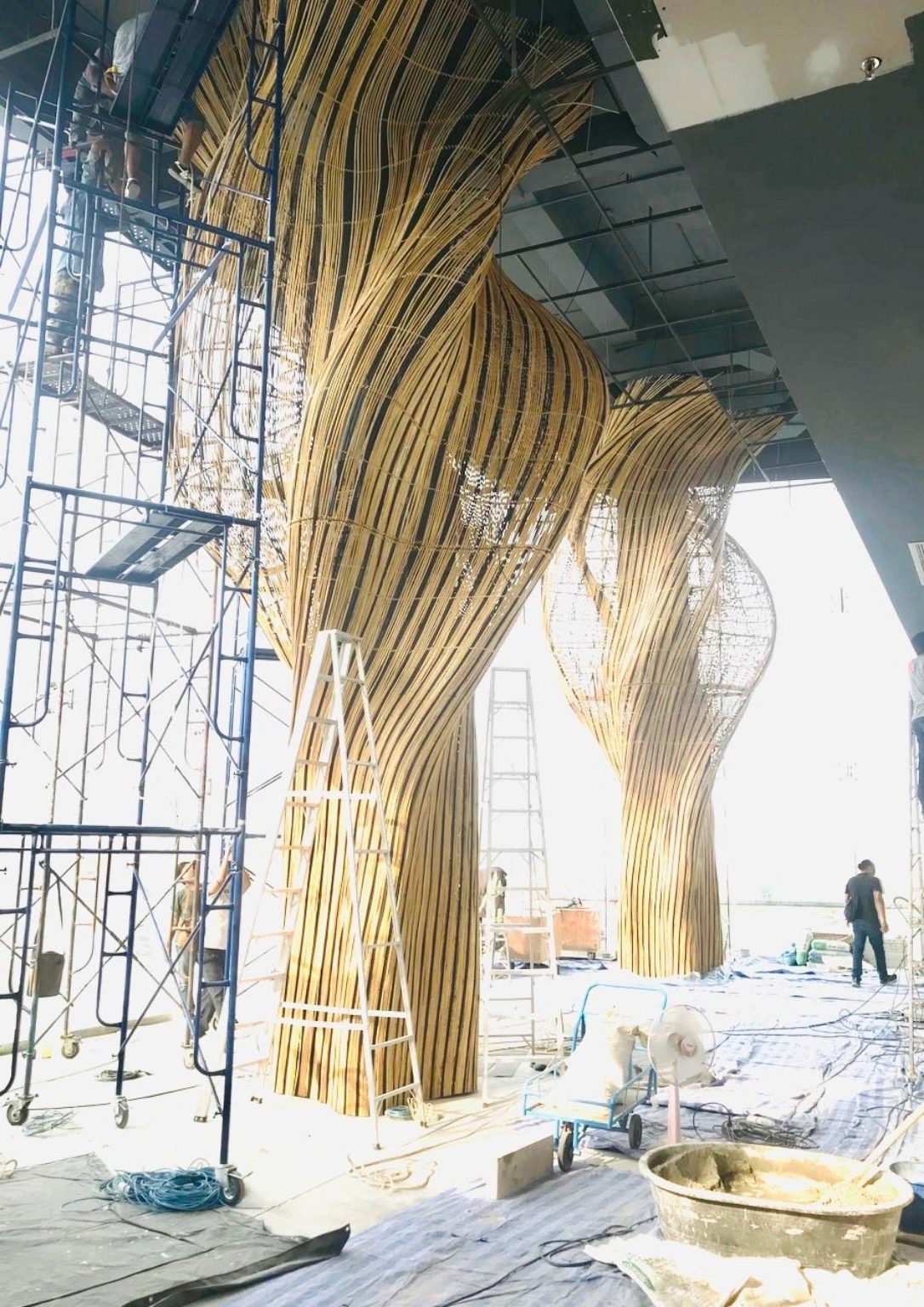 Two huge rattan pillars watch over the entire space. It imitates the skyscrapers that surround the vicinity. These traditional structures were created by using 3d special effect software to simulate fluidity. And then with marine technology software, the fabrication of special aluminum frames as support was made possible. Moreover, aside from the design function, the rattan also acts as a cover for the beer pipes, airconditioning tubes, and the like.