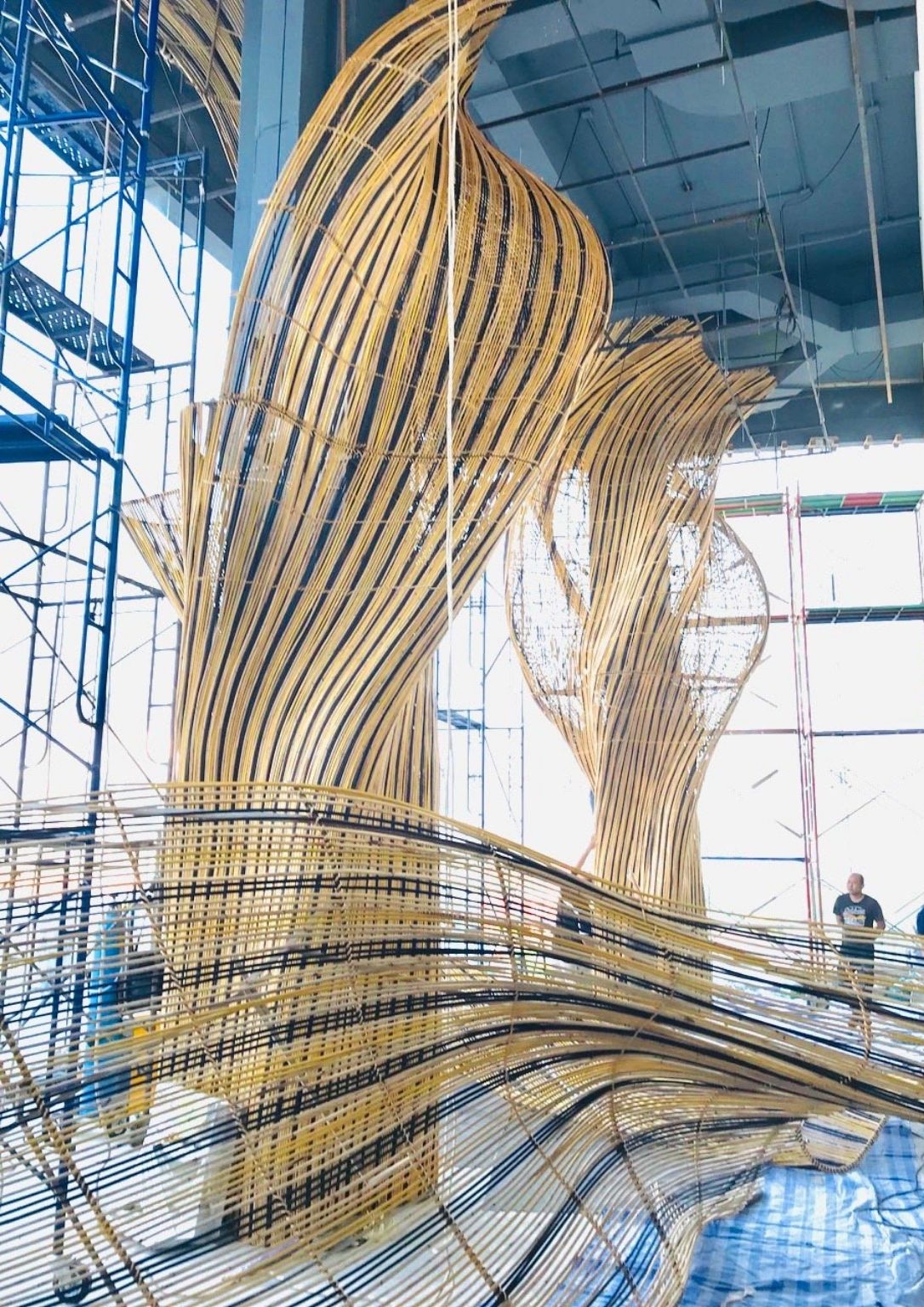 Gold hues tint the rattan sculptures, a color greatly attributed to Thailand’s temples. The color selection applied on a rather traditional material fuses Thai heritage with contemporary design. The use of rattan puts emphasis on the eco-friendly principle behind the whole construction. Zero plastic was used for the project. Moreover, all the pieces of furniture are handmade locally. The firm worked together with local tradesmen to create the rattan sculptures and other design installations.