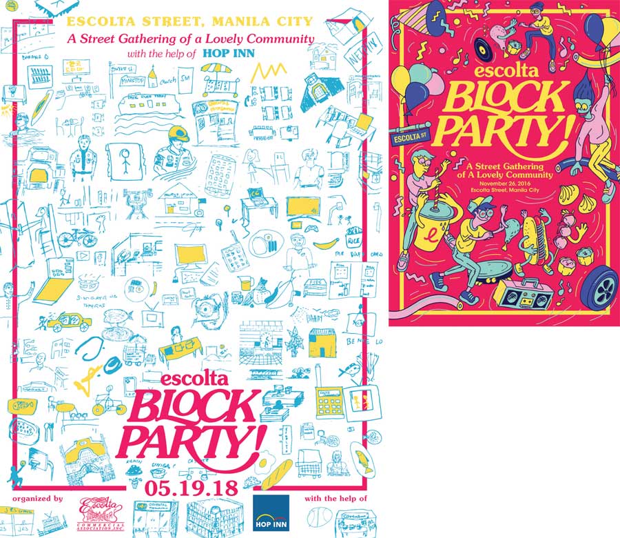 Before the last block party, artists Issay Rodriguez and Anjo Bolarda asked around what the immediate community—peanut vendors, security guards, kids on the street—thought of the event. “Most referred to it as: ah, yung party nila. (Oh, their party.) The mere fact that they called it ‘their party’ means that they feel excluded,” said Serrano. This prompted them to seek drawings from the community showcasing how they felt about Escolta. Over a hundred doodles were gathered through the workshops and exhibited at the Cool-In Coffee Shop nearby. Moreover, these became the main elements of the 6th Escolta Block Party’s official poster and collateral.